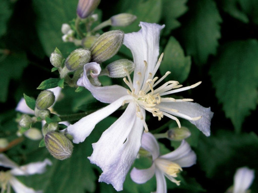 Clematis 'Praecox' - eine neuere, interessante Sorte von Clematis, die vor allem für ihre schönen Blüten bekannt ist. Ausgewachsen erreicht die Sorte eine Höhe von etwa 2–3 m, je nach Kulturbedingungen. Die Blätter sind tiefgrün gefärbt, haben eine eiförmige Form und eine ausgeprägte Spitze, sie fallen im Winter ab. Die Blüten sind eher klein und schneeweiß gefärbt. In der Mitte der Blüten befinden sich lange Staubgefäße mit Staubbeuteln, die gelb gefärbt sind. Nach der Blüte bilden sich flaumige Samenstände, die die Pflanze ebenfalls schmücken. Sie blühen im Zeitraum von Juli bis September. Sie gehört zur 2. Gruppe der Clematis, die ihren Schnitt bestimmt. Clematis sollten auf verschiedenen Arten von Stützen angebaut werden, z. B. an Pavillons, Gittern, Stöcken, Pergolen oder anderen Stützen. Die Clematis ist nicht anspruchsvoll in der Kultivierung, daher ist sie sowohl für Anfänger als auch für erfahrene Gärtner geeignet. Sie bringt einen zarten und romantischen Look in jeden Garten und sollte daher auch in Ihrem nicht fehlen.