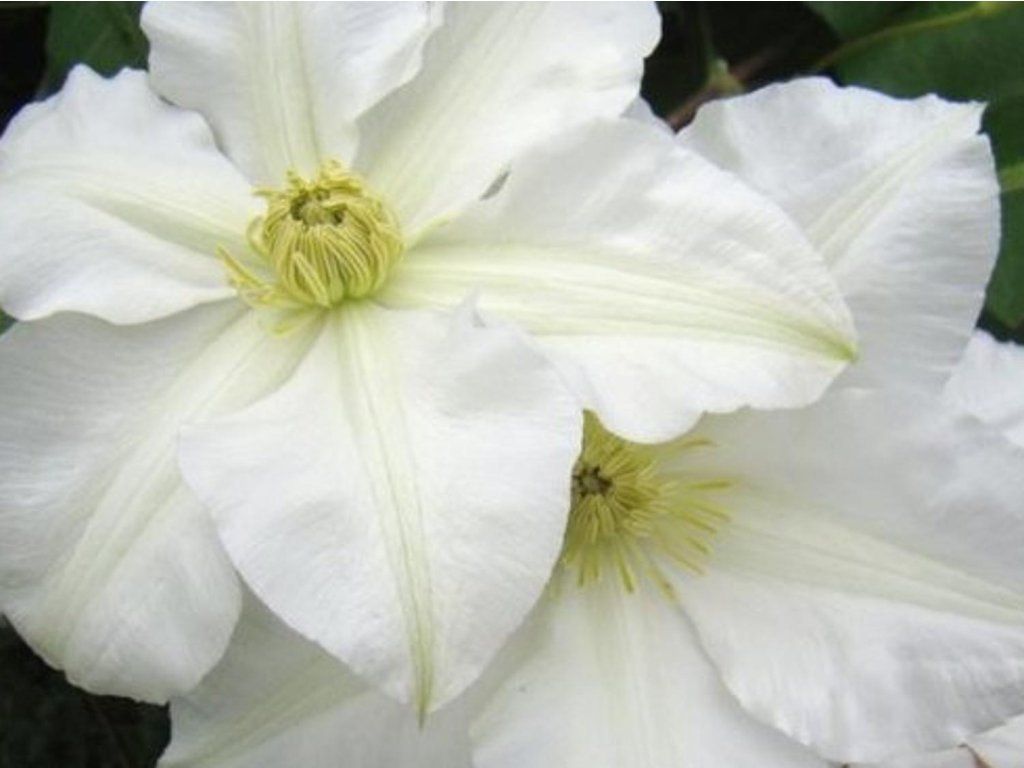 Clematis 'Toki' - eine japanische großblumige Sorte aus der Gruppe der früh blühenden, gezüchtet in der zweiten Hälfte des 20. Jahrhunderts und Ende der 1980er Jahre auf den Markt gebracht. Bildet eine mittelstark wachsende, laubabwerfende Liane mit verholzten Trieben, die sich mit rankenden Blattstielen an Stützen festhalten. Erreicht eine Höhe von ca. 2–3 m und eine Breite von ca. 1 m. Die Blätter sind mittelgrün, dreiteilig bis einfach und bilden einen ruhigen Hintergrund für die Blüten. Diese sind groß, 12–18 cm im Durchmesser, einfach, mit 6–8 ovalen, sich leicht überlappenden Kelchblättern in reinweißer Farbe. Die Mitte der Blüte wird von gelben bis cremefarbenen Staubgefäßen geschmückt, die den Blüten einen warmen Kontrast verleihen. Die Hauptblüte findet vom späten Mai bis Juni an den Trieben des Vorjahres statt, unter günstigen Bedingungen folgt im August und September eine zweite, schwächere Blüte an den Trieben des laufenden Jahres. Die Blüten sind ohne ausgeprägten Duft, ihre Wirkung beruht auf der einfachen, reinen Farbe. Die Sorte eignet sich hervorragend für Pergolen, Spalieren, Zäunen und Bögen, wo sie einen hellen Akzent setzt, der auch für kleinere Gärten geeignet ist. Lässt sich gut mit Strauch- und Kletterrosen, dunkelblättrigen Gehölzen oder mit Clematis anderer Farben kombinieren. Wie alle Clematis enthält sie giftige Stoffe, insbesondere in den Blättern und jungen Trieben; die Pflanze ist bei Verzehr gefährlich und beim Schneiden ist ein Hautschutz ratsam. Gehört zur 2. Gruppe der Clematis, die ihren Schnitt bestimmt.