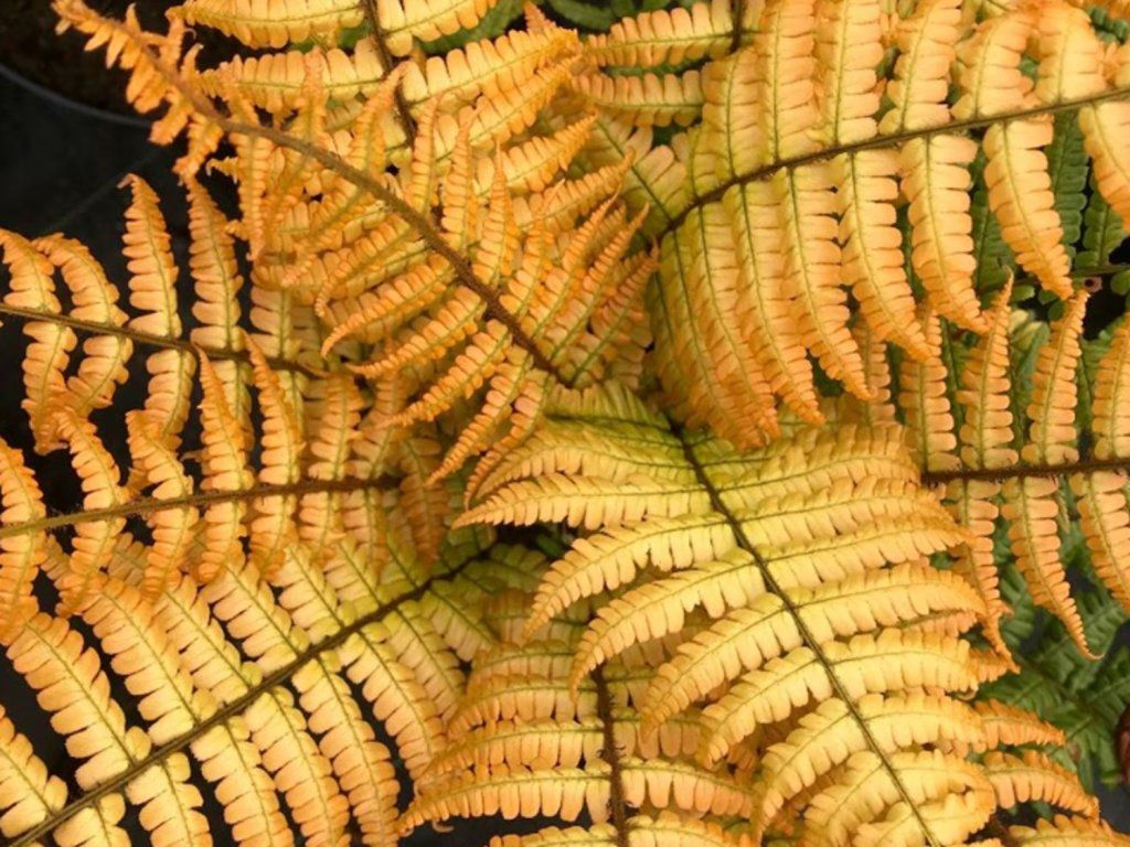 Frauenhaarfarn 'Jurassic Gold' - eine markante Farnsorte mit auffallend goldgelbem bis kupferorange austreibendem Laub, das allmählich in ein frischgrünes Farbbild übergeht. Im Vergleich zur botanischen Art zeichnet sie sich durch intensiver gefärbte junge Blätter und einen kompakteren, sehr effektiven Wuchs aus. Sie bildet dichte, regelmäßige Horste, die etwa 60–90 cm hoch und 60–80 cm breit werden. Die Blätter sind bogenförmig aufstrebend, 2- bis 3-fach gefiedert, fest und glänzend mit dunklen Blattstielen, die einen Kontrast zum hellen Frühlingslaub bilden. Junge Blätter treiben im Frühjahr in warmen Goldgelb- bis Bernsteintönen aus, was in schattigen Gartenbereichen einen starken visuellen Akzent setzt. Im Laufe der Saison stabilisiert sich die Farbe zu einem satten Grün. Wie andere Farne bildet sie weder Blüten noch Früchte; sie vermehrt sich durch Sporen, die sich auf der Unterseite der Blätter in regelmäßigen Büscheln bilden. Die Pflanze ist je nach klimatischen Bedingungen halbimmergrün bis immergrün; in strengen Wintern kann der oberirdische Teil erfrieren, regeneriert sich aber im Frühjahr zuverlässig aus dem Wurzelhals. Sie lässt sich gut mit Funkien, Christrosen, Purpurglöckchen oder Frühlingszwiebelblumen kombinieren, wo ihre goldenen Frühlingstöne den Kontrast zu den dunkleren Blättern der umliegenden Pflanzen hervorheben.