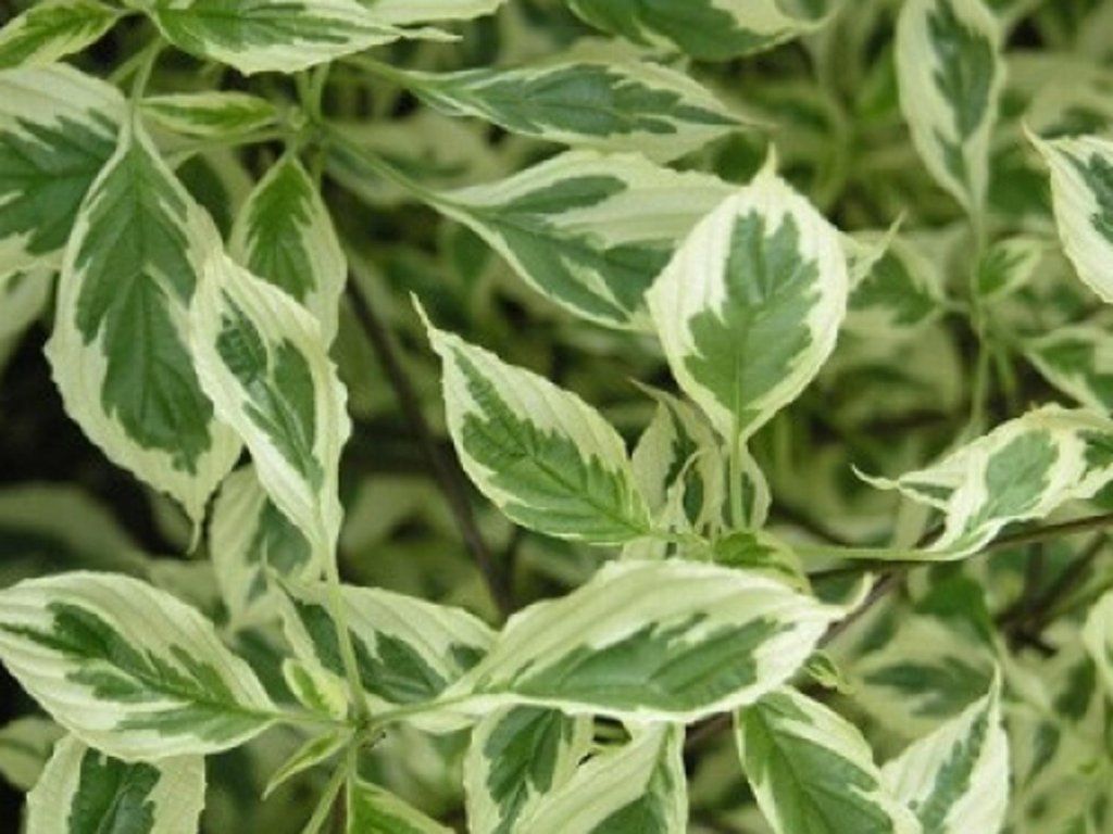 Hartriegel 'Argentea' - ein Zierstrauch, der im Laub abfällt und eine Höhe von etwa 3-4 m erreicht. Er bildet stufenförmige Äste, die mit grün-cremefarbenen, panaschierten Zierblättern bedeckt sind. Die Blüten erscheinen Ende April und sind cremefarben. Die Frucht ist eine blau-schwarze Beere. Mit dem Herbstbeginn nehmen die Blätter violette Farbtöne an. Ein außergewöhnlich schöner und interessanter Strauch, der einen Platz als Solitär in Ihrem Garten verdient.