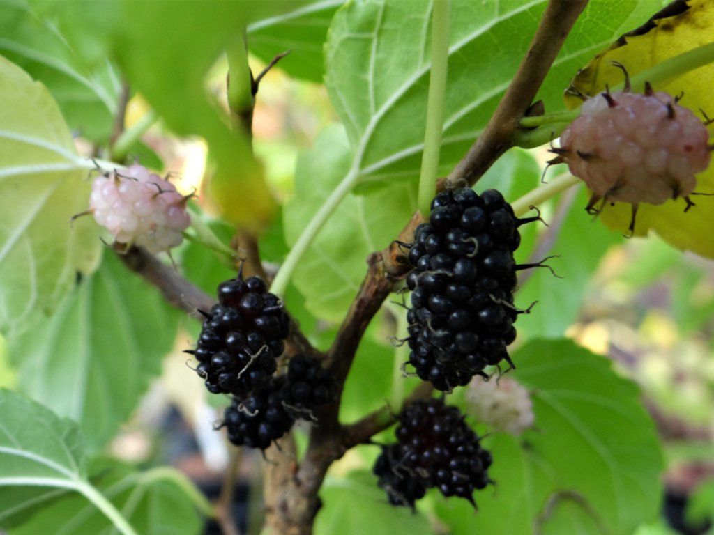 Weiße Maulbeere - stammt aus China, wird aber seit Jahrhunderten in den Mittelmeerregionen und wärmeren Teilen Mitteleuropas angebaut. Es handelt sich um einen Baum, der eine Höhe von etwa 10–15 Metern erreicht, mit einer regelmäßigen, luftigen Krone und einer kugelförmigen Form. Sie wächst sehr schnell. Seine Blätter sind auffällig, erreichen eine Länge von 6–18 cm und eine Breite von etwa 8 cm, haben eine asymmetrische, handförmige Form mit 3–5 Lappen und sind wunderschön tiefgrün. Die Maulbeerfrüchte reifen in den Sommermonaten und nehmen eine gelbliche bis violette und schwarze Farbe an. Sie sind sehr süß und aromatisch mit einem ausgeprägten Geschmack und gehören zu den Früchten mit hohem Vitamin-C-Gehalt. Dieser Baum bevorzugt gut durchlässigen und fruchtbaren Boden, der von Sonnenlicht beschienen wird. Er gehört zu den Bäumen, die im Frühjahr am spätesten austreiben. Historisch wurde er als Futterpflanze für die Raupen des Seidenspinners gezüchtet, die zur Seidenproduktion aus Kokons dienten. Diese Praxis reicht in Europa bis ins 16. Jahrhundert zurück. Heute ist die weiße Maulbeere wegen ihrer schmackhaften Früchte sowie ihres Aussehens, ihres schnellen Wachstums und ihrer Widerstandsfähigkeit beliebt. Die Pflanzung dieses Baumes wird in privaten Gärten immer beliebter, wo er als dominierender Baum dient, der angenehmen Schatten spendet. Es gibt viele Kultivare, darunter sterile Pflanzen, die sich zur Schaffung schattiger Nischen eignen. Seine Fähigkeit zur einfachen Formgebung durch Schnitt trägt zu seiner vielseitigen Nutzung bei.