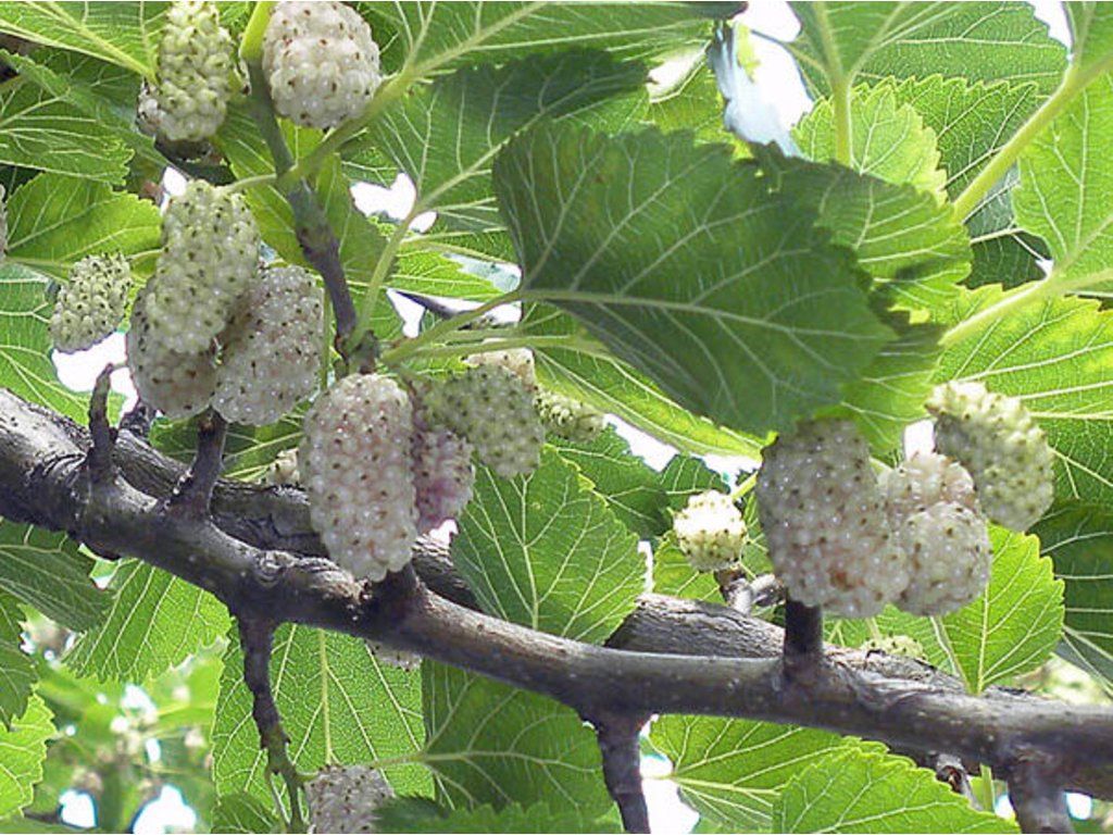 Weiße Maulbeere 'White Berry' - eine Obstsorte aus China, die in Europa auch wegen ihrer Blätter angebaut wird, die bei der Seidenraupenzucht verwendet werden. Die Sorte 'White Berry' ist eine Selektion, die für ihre reinweißen Sammelfrüchte mit ausgeprägt süßem Geschmack und feinem Aroma geschätzt wird. Der Baum bildet im Erwachsenenalter eine lockerere, ausladende Krone von etwa 4 m Höhe und 3–4 m Breite. Die Blätter sind herzförmig bis gelappt, im Sommer dunkelgrün und vergilben im Herbst. Unauffällige Blütenstände erscheinen im Mai bis Juni, danach bilden sich Früchte, die sich allmählich im Juli bis August entwickeln, in warmen Lagen manchmal schon Ende Juni oder Anfang Juli. Dank ihrer hellen Farbe eignet sie sich zum direkten Verzehr, für Obstsalate, zum Trocknen und für hausgemachte Säfte, wo sie die Farbe nicht so stark verdunkeln wie dunkle Maulbeeren. Die Früchte enthalten natürlicherweise Zucker, Ballaststoffe und Vitamin C, weshalb sie traditionell als Sommerobst in die Ernährung integriert werden. Die Sorte ist meist selbstfruchtbar, weitere Maulbeerbäume in der Umgebung fördern jedoch oft den Fruchtansatz. Die Rinde ist graubraun und im Alter längsrissig, junge Zweige sind spröder und sondern bei Verletzung einen milchigen Saft ab. Zur Reifezeit wird der Baum stark von Vögeln besucht, daher wird die Ernte mit einem Netz geschützt, wenn sie für die Küchenverarbeitung bestimmt ist.