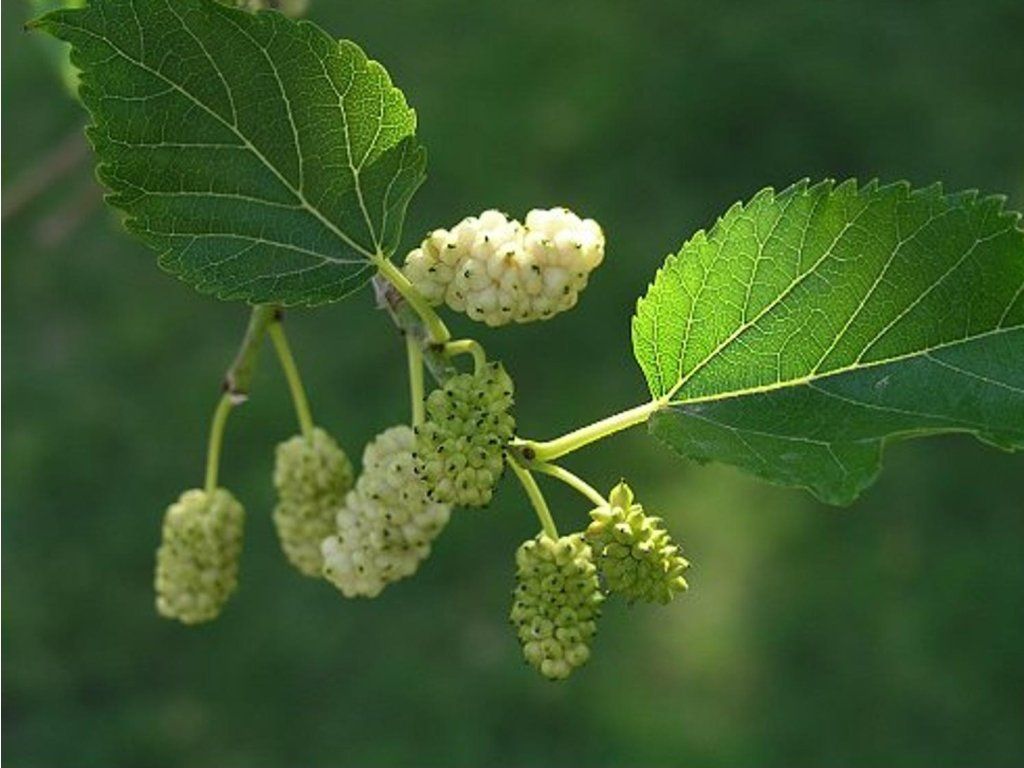 Weiße Maulbeere – stammt aus Ostasien, hauptsächlich aus China, wo sie seit Jahrtausenden nicht nur wegen ihrer Früchte, sondern auch als Hauptwirtspflanze für die Seidenraupenzucht angebaut wurde. Nach Europa gelangte sie bereits im Mittelalter und wurde in wärmeren Regionen zu einem festen Bestandteil ländlicher Gärten und Obstplantagen. Im ausgewachsenen Zustand erreicht sie normalerweise eine Höhe von 10–15 m und eine Breite von 8–12 m, mit einer ausladenden, dicht verzweigten Krone. Die Blätter sind sehr variabel, ganzrandig oder gelappt, 8–15 cm lang, tiefgrün und verfärben sich im Herbst gelb. Die Blüten sind unscheinbar, einhäusig und erscheinen im April bis Mai. Die Frucht ist ein Sammelbalg, genannt Maulbeere, der von Juni bis Juli reift. Die Früchte sind weiß, cremefarben bis hellrosa, weich, süß und saftig, mit geringerer Säure als bei der schwarzen Maulbeere. Sie werden frisch, getrocknet, für Marmeladen, Sirupe und zum Backen verwendet und enthalten natürlicherweise Zucker, Ballaststoffe und Mineralstoffe. Der Baum ist oft einhäusig und trägt normalerweise Früchte, ohne dass eine Bestäubung erforderlich ist. Dank seines schnellen Wachstums und seines dichten Laubes spendet er tiefen Schatten und eignet sich auch als Solitär in der Landschaft. Die Pflanzung dieses Baumes wird in privaten Gärten immer beliebter, wo er als dominierender Baum dient, der angenehmen Schatten spendet. Es gibt viele Kultivare, darunter sterile Pflanzen, die sich zur Schaffung schattiger Nischen eignen.