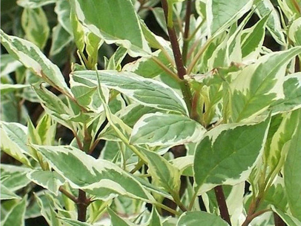 Hartriegel 'Elegantissima' - ein mittelgroßer Strauch, der 1-3 m hoch wird, besticht vor allem durch seine cremefarben panaschierten, ovalen Blätter. Die cremefarbene Panaschierung wird im Laufe des Jahres rosa, bis schließlich das gesamte Blatt rot wird. Bevorzugt sonnige Standorte.