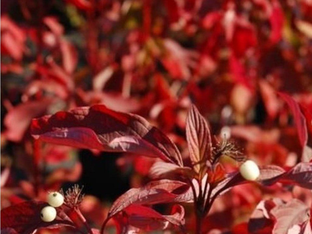 Weißer Hartriegel BATON ROUGE 'Minbat' - zarte, dekorative Sorte, die einen kompakten Wuchs mit üppigem Wachstum kombiniert. Im Erwachsenenalter erreicht sie eine Höhe und Breite zwischen 0,9 und 1,2 m. Schon im Frühjahr fallen die leuchtend roten Stiele auf, auf denen bronzefarbene, spitze Blätter austreiben. Diese haben im Laufe der Saison eine dunklere, grüne Farbe. Im Herbst sind sie jedoch leuchtend rot. Im Winter bleiben die bereits erwähnten roten Stiele sichtbar, die so auch in der ruhigen Winterzeit den Garten zum Leuchten bringen können. Die Blüten sind eher unscheinbar, haben eine cremige Farbe und erscheinen im Mai und Juni. Danach folgen kleine, für den Menschen giftige Beeren.