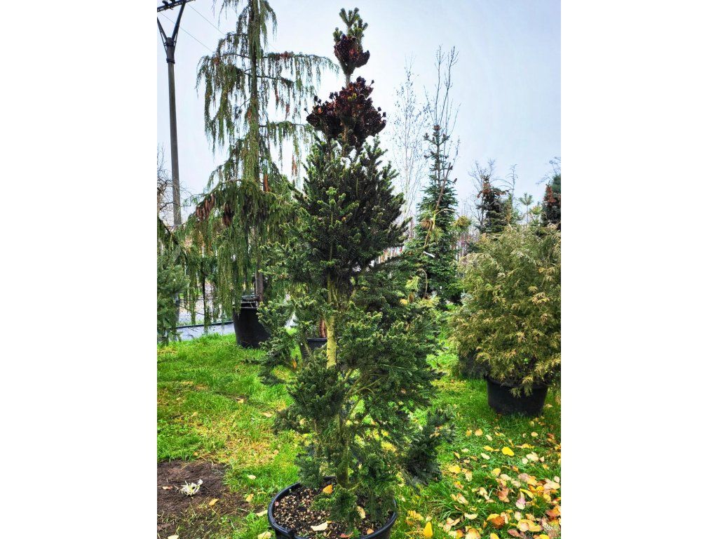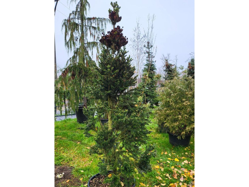 Weißtanne 'Pyramidalis' - eine hoch elegante und formstabile Sorte, die sich durch ihren streng kegelförmigen, nahezu geometrisch präzisen Habitus und dichten Verzweigungen auszeichnet, was sie zu einem idealen Element für formelle Gartenkompositionen macht. Diese Sorte wächst eher langsam und kompakt, wobei sie im Erwachsenenalter normalerweise eine Höhe von 5 bis 8 Metern und eine Breite von etwa 2 bis 3 Metern erreicht, was sie zu einer perfekten Wahl für mittelgroße Gärten, repräsentative Gebäudeeingänge oder als vertikales Solitärgehölz in modernen Gärten macht. Das auffälligste Merkmal dieser Sorte ist ihre regelmäßige Form, bei der die Äste leicht nach oben wachsen, wodurch eine sehr dichte und kompakte Krone voller dunkelgrüner Nadeln entsteht, die auf der Unterseite zwei deutliche silbrige Streifen aufweisen, was den Baum auch aus der Ferne sehr dekorativ erscheinen lässt. Diese Sorte wird für ihre Fähigkeit geschätzt, ihre Form ohne Schnitt zu erhalten und dem Garten das ganze Jahr über Struktur und Farbe zu verleihen. Die Stämme sind sehr fest, dicht angeordnet und tragen dank ihres Anstellwinkels auch größere Schneelasten ohne Bruch- oder Verformungsgefahr der Krone. Im Garten eignet sich dieser Kultivar als unübersehbarer Solitär, als Teil formeller Gruppenpflanzungen oder als repräsentatives Element in Parks und Gärten.