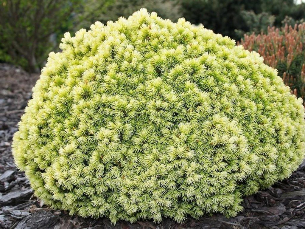 Blau-Fichte 'Dendrofarma Gold' - stammt aus kälteren Regionen Nordamerikas, wo sie in borealen Wäldern auf überwiegend sauren Böden wächst. Die Sorte 'Dendrofarma Gold' entstand in Polen als Zwergwuchs-Auslese mit kompaktem Habitus und hervorgehobener Frühlingsfärbung. Die Pflanze bildet eine dichte, fein strukturierte Krone, anfangs kugelförmig, später auch breit kegelförmig. Die Nadeln sind kurz und fühlen sich weicher an, um die Triebe herum in dichten „Bürsten“ angeordnet. Neue Triebe treiben zitronen- bis goldgelb aus und verfärben sich im Laufe des Sommers grün. Der jährliche Zuwachs beträgt etwa 2–4 cm, daher bleibt die Pflanze lange klein und erreicht im ausgewachsenen Zustand normalerweise eine Höhe und Breite von etwa 0,6 m. Im April bis Mai können sich Pollenzapfen und bei älteren Pflanzen auch kleine Zapfen bilden. Im Vergleich zur üblicherweise kultivierten Fichte 'Conica' bietet sie eine ausgeprägtere Frühlingsfarbe bei ähnlich langsamem Wachstum. In der Komposition wirkt sie als heller Punkt zwischen dunkelgrünen Nadelbäumen, Heidekraut, Blaubeeren und Rhododendren und kommt auch bei Steinen und Schotterbeeten gut zur Geltung. Die Nadeln verströmen beim Zerreiben einen zarten harzigen Duft. Ideal für Behälter, Steingärten, kommt sie in Gesellschaft mit anderen Koniferen und Ziersträuchern gut zur Geltung.