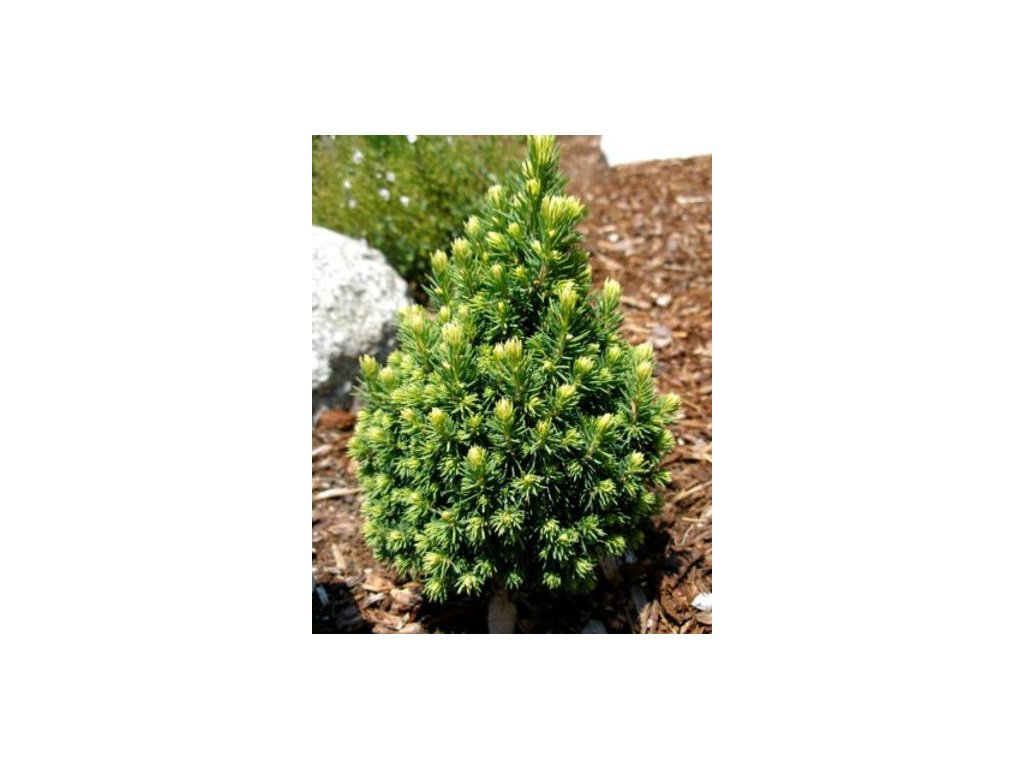 Weiß-Fichte 'Pixie Dust' - extrem zwergwüchsiger Kultivar mit dichtem und kegelförmigem Wuchs. Die Nadeln sind kurz und graugrün gefärbt. Charakteristisches Merkmal dieses Kultivars ist die ausgeprägte gelbe Färbung der neuen Triebe im Sommer, was einen schönen Kontrast zum älteren Nadelwerk bildet. Mit 10 Jahren erreicht er eine Höhe von etwa 40 cm und eine Breite von 15 cm. Die jährlichen Zuwächse betragen etwa 2,5 cm.