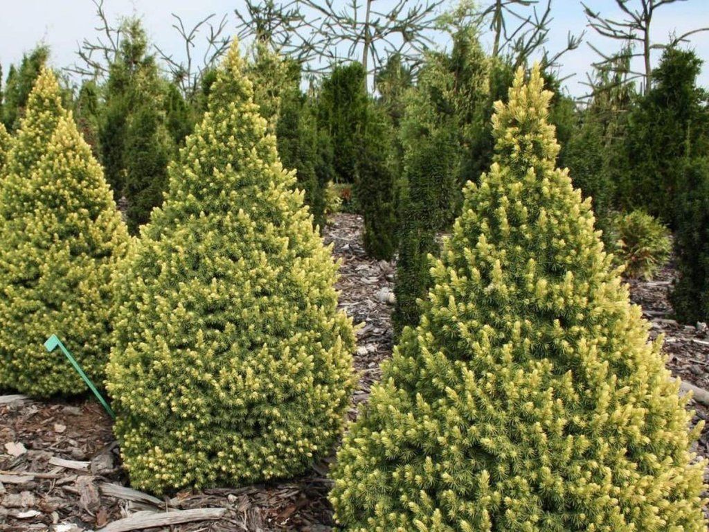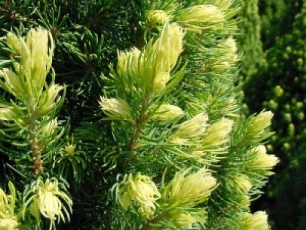 Weiß-Fichte 'Rainbow's End' - eine Sorte, die 'Daisy´s White' sehr ähnlich ist. Erreicht eine Höhe von 1 - 2 m und eine Breite von 0,6 - 1,2 m. Er ist ebenfalls langsam wachsend, hat eine konische Form und seine Beliebtheit beruht auf den cremefarbenen Nadeln. Dank der zahlreichen Nadeln wirkt sie dicht, die jungen Triebe sind cremefarben-gelb gefärbt, so dass die gesamte Pflanze buchstäblich strahlt. Die cremefarbene Färbung wandelt sich dann allmählich in eine grün-gelbe bis rein grüne Farbe. Neue Triebe sprießen auch im Sommer, wodurch ein sehr interessanter zweifarbiger Effekt entsteht, bei dem die sprießenden Triebe an den Astenden leuchten und der Rest des Baumes grün gefärbt ist. Die Sorte ist sehr gut frostbeständig. Eignet sich für den Anbau im Steingarten, in einem Topf oder für die Gruppenbepflanzung.