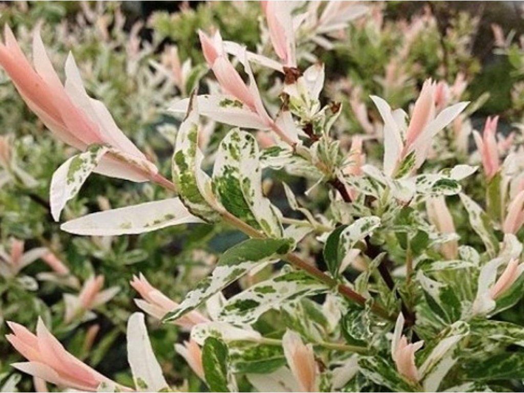 Weide 'Hakuro Nishiki' - ein laubabwerfender Zierstrauch aus der Gattung Salix, dessen botanische Art aus Ostasien (Japan, Korea, Nordostchina und dem russischen Fernen Osten) stammt. Die Sorte wurde in Japan ausgewählt und verbreitete sich Ende des 20. Jahrhunderts in der europäischen Gartenkultur, ihre Einführung in Europa wird auf das Jahr 1979 datiert. Im Handel ist sie manchmal auch unter dem Synonym 'Albo-maculata' erhältlich oder wird als Salix × integra bezeichnet. In tschechischen Gärten wird sie als dichter Strauch oder als auf einen Stamm veredelter Baum gezogen, wo sie eine kugelförmige Krone bildet. Die Blätter sind schmal elliptisch bis lanzettlich, meist 3–5 cm lang, treiben im Frühling cremeweiß aus und nehmen schnell einen rosa Schimmer an, später werden sie grün mit unregelmäßiger weißer Panaschierung. Junge Triebe haben oft orange bis rotbraune Töne und verleihen dem Strauch im Winter einen feinen Farbakzent. Die Kätzchen sind klein und unauffällig und treten unter den Bedingungen der Tschechischen Republik am häufigsten im April auf. In Kompositionen wird sie an Wasserelementen, in Vorgärten und in gemischten Strauchgruppen eingesetzt, wo sie dunklere Nadelgehölze, Spiersträucher, Hortensien oder Ziergräser aufhellt.