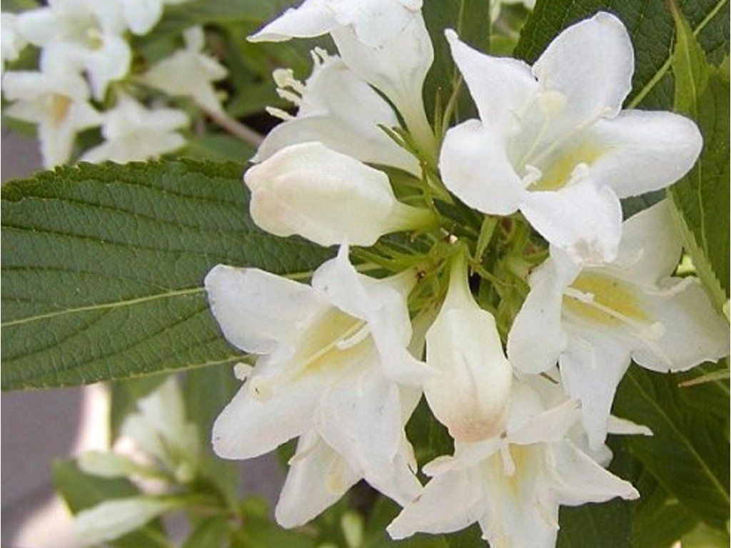 Weigela 'Candida' - ein aufrecht wachsender, laubabwerfender Strauch, der eine Höhe von 2-3 m und eine Breite von etwa 1,5-2 m erreicht. Blüht von Mai bis Juni mit reinweißen, glockenförmigen Blüten. Wird durch Schnitt geformt, am besten gleich nach der Blüte. Macht sich als Solitärpflanze hervorragend. Eignet sich auch für Hecken oder gemischte Strauchpflanzungen. Die Sorte lockt Bestäuber wie Bienen oder Hummeln an. Ein wunderschöner Kontrast bildet sich zum Beispiel mit einer weiteren Weigelie oder mit einer Deutzie.