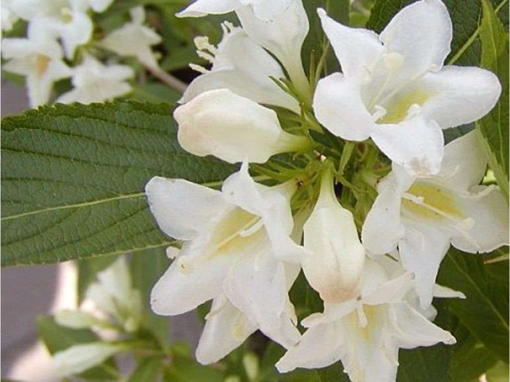 Weigelie 'Candida' - aufrecht wachsender, laubabwerfender Strauch, der eine Höhe von 2-3 m und eine Breite von 1,5-2 m erreicht. Blüht von Mai bis Juni mit reinweißen Blüten. Wird durch Schnitt geformt, am besten gleich nach der Blüte. Benötigt leicht feuchte Böden in sonniger Lage.