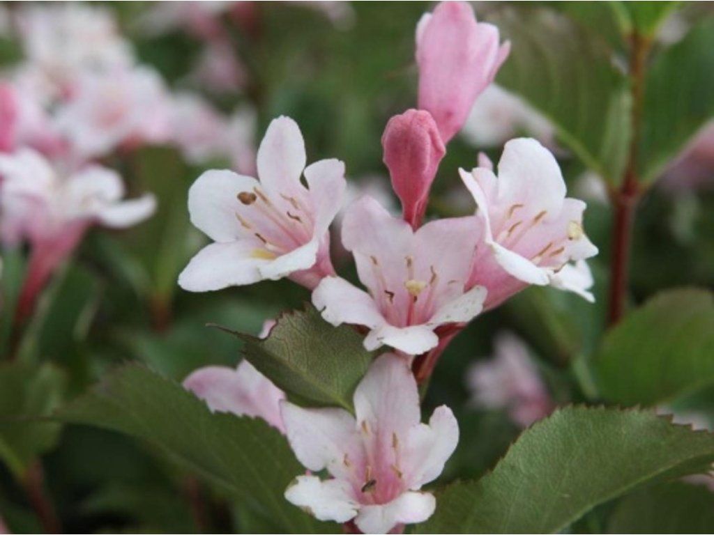Blühende Weigelie 'Polka' - außergewöhnlich lange blühender Weigelien-Kultivar. Dieser Strauch erreicht eine Höhe von 0,9–1,2 m und eine Breite von 1,2–1,5 m. Ende des Frühlings erscheinen reichlich duftende, röhrenförmige Blüten in Zartrosa. Im Laufe des Sommers wiederholt sie ihre Blüte, aber nicht mehr in diesem Ausmaß. Spitz zulaufende, lanzettliche Blätter sind mittelgrün. Im Herbst fallen sie ab.