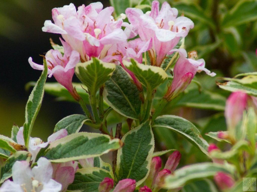 Weigelie 'Variegata' - ein Strauch, der je nach Kulturbedingungen eine Höhe von 2 m und eine Breite von etwa 2 bis 3 m erreicht. Er wächst mittelschnell. Der Habitus ist ausgebreiteter, aber regelmäßig. Die Triebe haben eine rotbraune Färbung. Die Blätter sind oval, zugespitzt, bis zu 12 cm lang und 7 cm breit. Sie haben eine frische grüne Farbe mit unregelmäßiger cremefarbener Panaschierung am Rand. Die Blüten sind 4 cm lang und etwa 3 cm breit. Sie sind glockenförmig, außen rosa, innen hellrosa mit einem Hauch von Weiß. Sie blüht sehr reichlich von Mitte Mai bis Ende Juni. Die Blüten sind zu mehreren in Trauben gesammelt und bilden sich an den letztjährigen Trieben.