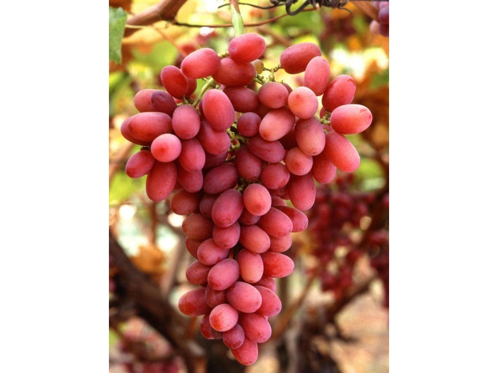 Weinrebe 'Crimson Seedless' - kernlose Tafelweinrebe aus den USA, Kalifornien, entstanden aus der Kreuzung der Sorten Emperor × Selece C33-199 im Jahr 1989. Es handelt sich um eine ausgeprägte rotviolette bis karminrote Sorte, die Beeren haben eine ovale bis zylindrische Form, ihre Größe beträgt 4-5 g. Die Trauben erreichen unter optimalen Bedingungen ein Gewicht von bis zu 500 g. Das Fruchtfleisch ist fest, knackig und süß mit einem neutral-fruchtigen Geschmack, was sie zu einer sehr begehrten Sorte für den Verzehr am Tisch macht. Sie weist eine hohe Wuchsstärke auf und erfordert eine ordnungsgemäße Gerüstführung. Die Reifung erfolgt später, sie wird zu den späten bis sehr späten Tafelsorten gezählt, die Ernte kann normalerweise von Mitte September bis November erfolgen. Sie ist primär für den direkten Verzehr frischer Trauben bestimmt. Die Beerenhaut ist relativ dick, was die Widerstandsfähigkeit gegen Rissbildung verbessert und auch dem Transport besser standhält. Sie ist gut resistent gegen Pilzkrankheiten. Kann in Gewächshäusern oder im Freiland angebaut werden.