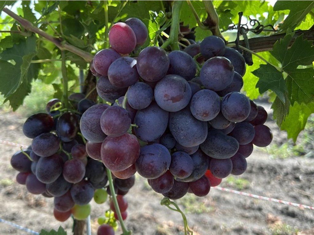 Weinrebe 'Everest' - eine neu gezüchtete Tafeltraubensorte, die sich durch ihren hervorragenden Geschmack und zuverlässige Erträge auszeichnet. Die Beeren sind groß, oval bis leicht länglich, mit einem Durchschnittsgewicht von 16-25 g. Die Schalenfarbe ist dunkelweinrot bis burgunderfarben. Die Trauben sind ebenfalls kräftig, etwa 800-1000 g. Das Fruchtfleisch ist fest, knackig, saftig und sehr schmackhaft mit einem optimalen Zuckergehalt. Sie gehört zu den frühen bis mittelfrühen Sorten, die Ernte ist je nach Bedingungen ab Anfang September oder Ende August möglich. Sie zeigt eine sehr gute Frostbeständigkeit und Resistenz gegen gängige Pilzkrankheiten. Sie eignet sich für ein breites Spektrum von Standorten und ist dank reicher, regelmäßiger Ernten eine beliebte Wahl sowohl für kommerzielle als auch für private Winzer.