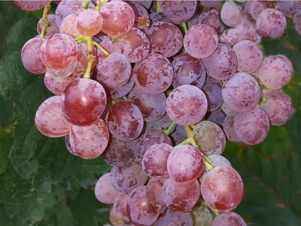 Weinrebe 'Kalina' - eine kernlose Tafeltraubensorte, die für den direkten Verzehr geeignet ist. Ihr Ursprung liegt in Moldawien, genauer gesagt im Forschungsinstitut in Chișinău, wo sie als komplexer Hybrid gezüchtet wurde. Die Früchte haben eine rosarot bis purpurne Schalenfarbe, die Beeren sind mittelgroß (ca. 4–5 g) und das Traubengewicht erreicht 500–800 g bis 1,2 kg. Der Geschmack der Früchte ist süß mit einem feinen fruchtigen Aroma, die Schale ist spürbar zart und das Fruchtfleisch saftig. Die Reifezeit ist früh bis mittelfrüh, die Früchte reifen in der ersten Septemberhälfte. Die Widerstandsfähigkeit der Sorte zeichnet sich durch Frostbeständigkeit bis ca. –23 °C und Resistenz gegen Krankheiten aus. Sie eignet sich für Pergolen, Pavillons oder als Kletterpflanze über Terrassen, aber auch für die heimische Verarbeitung zu Most oder Säften.