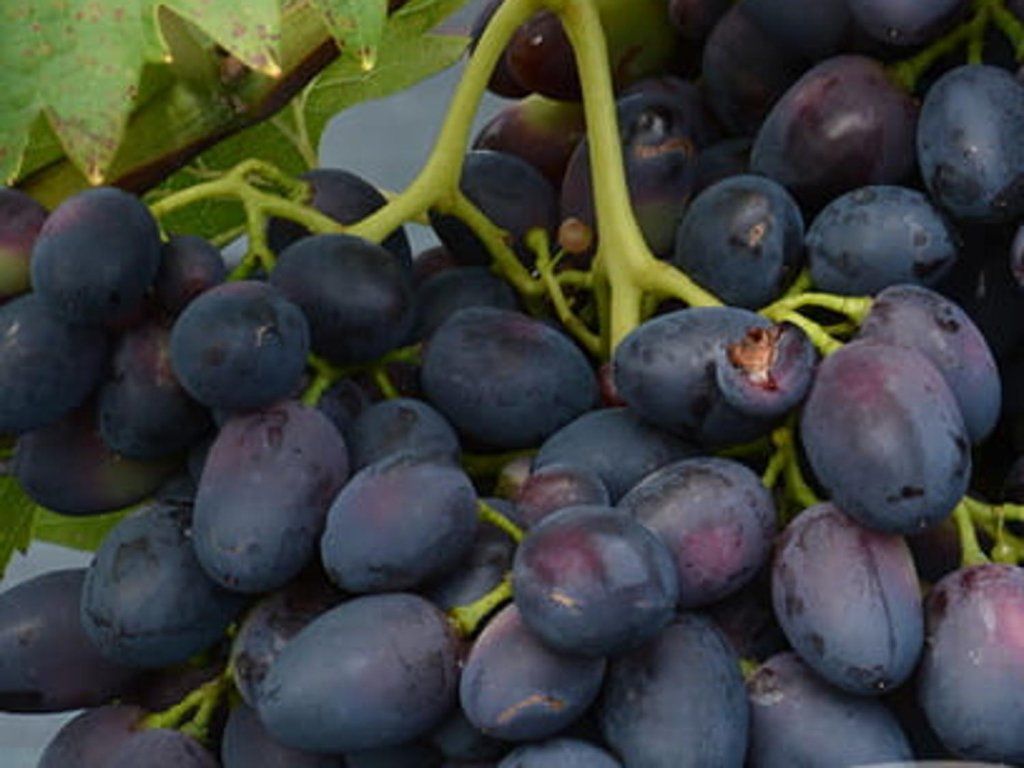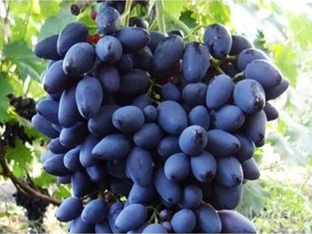 Weinrebe 'Nadeschda Azos' - eine Tafeltraube, gezüchtet an der russischen experimentellen Station AZOS in Anapa. Sie stammt aus der Kreuzung Moldova × Cardinal. Die Beeren sind dunkel blau-violett, von länglich-flaschenförmiger Gestalt. Die Trauben sind kegelförmig, lockerer mit einem Durchschnittsgewicht von 500–800 g. Das Fruchtfleisch ist fleischig, saftig und von harmonischem Geschmack, mit hohem Zuckergehalt und niedrigem Säuregehalt. Die Reifezeit ist mittelfrüh, reift etwa Mitte September und später. Was die Widerstandsfähigkeit betrifft, verträgt sie Fröste bis ca. –24 °C, hat eine gute Resistenz gegen Falschen Mehltau, Grauschimmel und Echten Mehltau. Das Wachstum der Sorte ist kräftig, die Rebe verholzt gut und hat eine hohe Ertragsfähigkeit. Sie eignet sich für den direkten Verzehr, die Herstellung von Dessertweinen, Marmeladen oder Sirupen. Sie verträgt Ernte, Transport und Lagerung gut. Sie gehört zu den hochwertigsten Tafeltraubensorten. Wir empfehlen, sie an sonnigen oder leicht schattigen Standorten zu pflanzen, damit die Früchte richtig ausreifen.