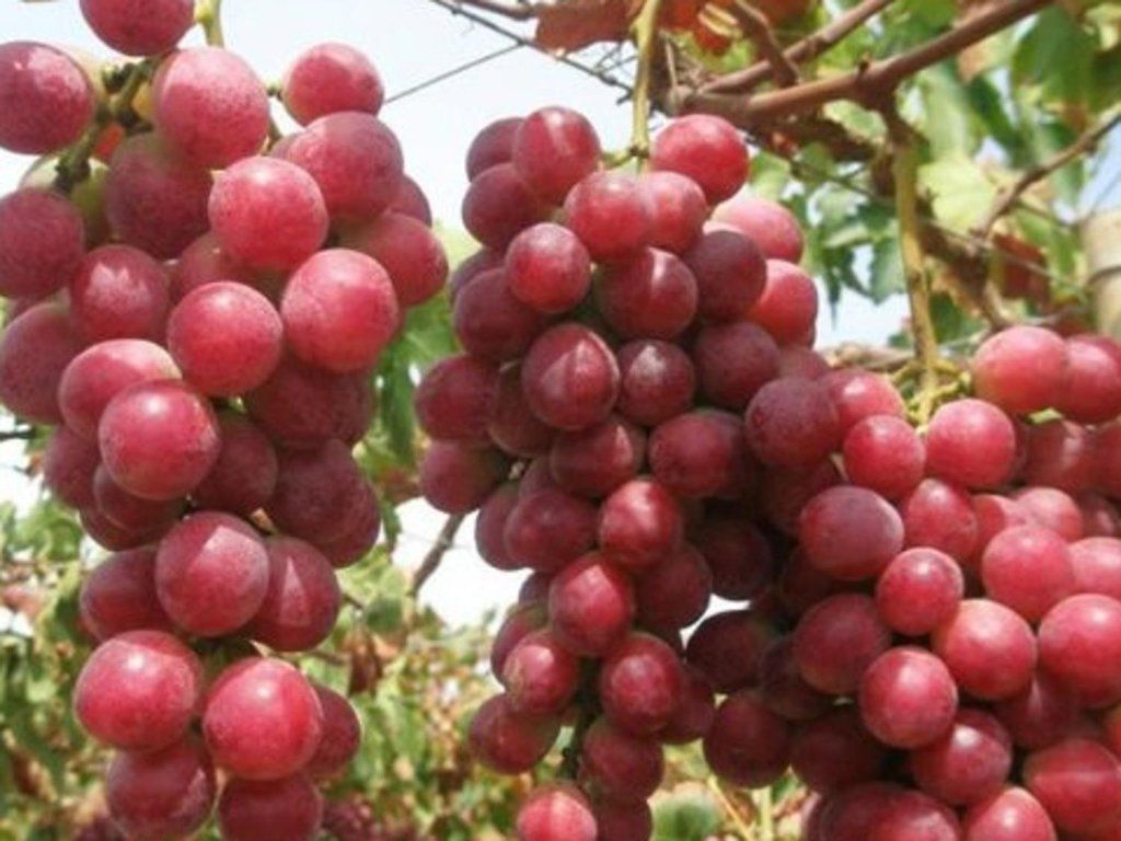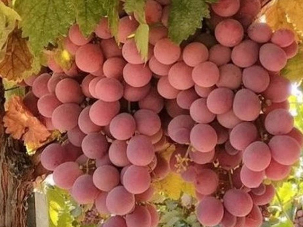 Weinrebe 'Red Globe' - eine Tafeltraubensorte aus Kalifornien, bekannt für ihre großen, runden und leuchtend roten Beeren. Die Trauben sind groß und relativ dicht mit einem Gewicht von normalerweise 400–600 g. Sie sind fest und saftig mit einem leicht süßen, fruchtigen, pikanten, würzigen Geschmack, geeignet für den direkten Verzehr und für den Export. Das Fruchtfleisch ist knackig und aromatisch, die Schale fest, was eine gute Lagerfähigkeit und Transportfähigkeit ermöglicht. Die Weinrebe reift mittelspät, die Ernte erfolgt von Ende September bis Oktober, abhängig vom Klima. Die Sorte hat ein kräftiges Wachstum, verträgt die Erziehung an Drahtgerüsten und Pergolen gut, die Trauben entwickeln sich gleichmäßig und sind nicht anfällig für Rissbildung. Sie ist relativ resistent gegen übliche Krankheiten, aber junge Pflanzen benötigen Schutz vor stärkeren Frösten unter –18 °C. Diese Sorte wird für den Tafelkonsum, das dekorative Aussehen der Trauben und den zuverlässigen Ertrag auch in kleineren Gartenweinbergen geschätzt. Kann auch im Topf angebaut werden.