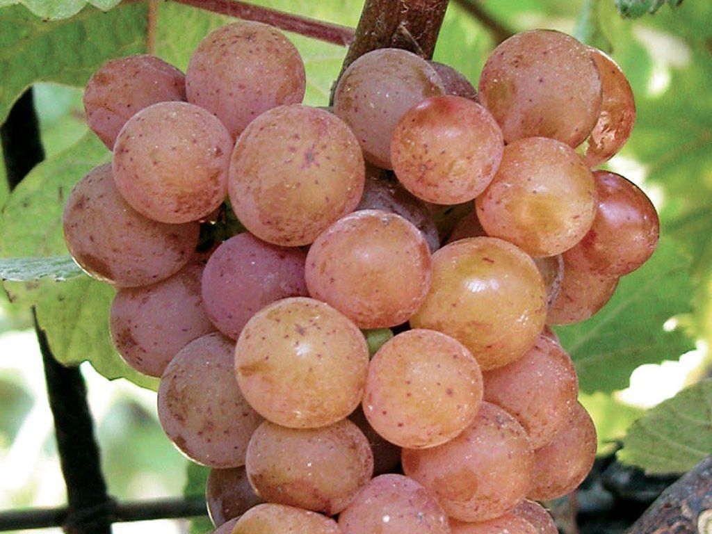 Weinrebe 'Traminer' - eine alte Mostrebe. Sie ist selbstfruchtbar. Die Früchte sind klein bis mittelgroß, rund und sehr aromatisch. Die Schale ist rosa bis grau-rot und mitteldick. Die Reife tritt Mitte Oktober ein.