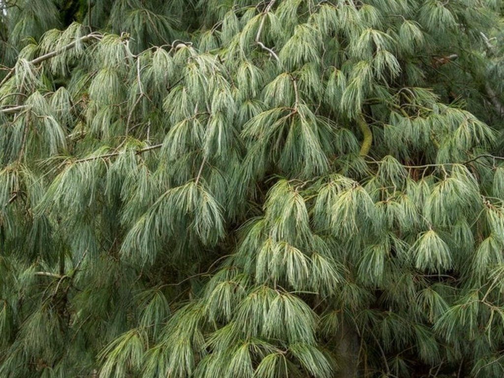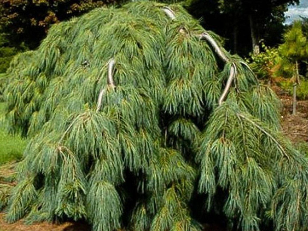 Weymouth-Kiefer 'Pendula' - eine hängende Sorte der nordamerikanischen Weymouth-Kiefer, die eine unregelmäßige, breit ausladende Krone mit zunächst waagerechten und dann schleierartig herabhängenden Ästen bildet. Das Aussehen ist je nach Anbindung und leichter Formgebung in der Jugend stark variabel, daher entwickelt sich jedes Exemplar etwas anders. Die Nadeln sind weich, 6–12 cm lang, wachsen in Fünferbündeln und haben eine grüne bis blaugrüne Farbe mit einem feinen silbrigen Schimmer. Im Mai erscheinen gelbe männliche Zapfen, Ende Sommer und im Herbst reifen längliche Zapfen. Im Erwachsenenalter bewegt sie sich meist um eine Höhe von 1–3 m und eine Breite von 2–4 m, bei langfristiger Anbindung kann sie auch höher wachsen. Die Sorte wirkt natürlich an Steinen und Wasser, kontrastiert schön mit feinen Gräsern, Heidekraut und Bodendeckersträuchern, in größeren Gärten kann sie auch als frei geformte Dominante eingesetzt werden. Die endgültige Form dieser Kiefer ist sehr variabel, jedes Individuum ist ein Unikat.