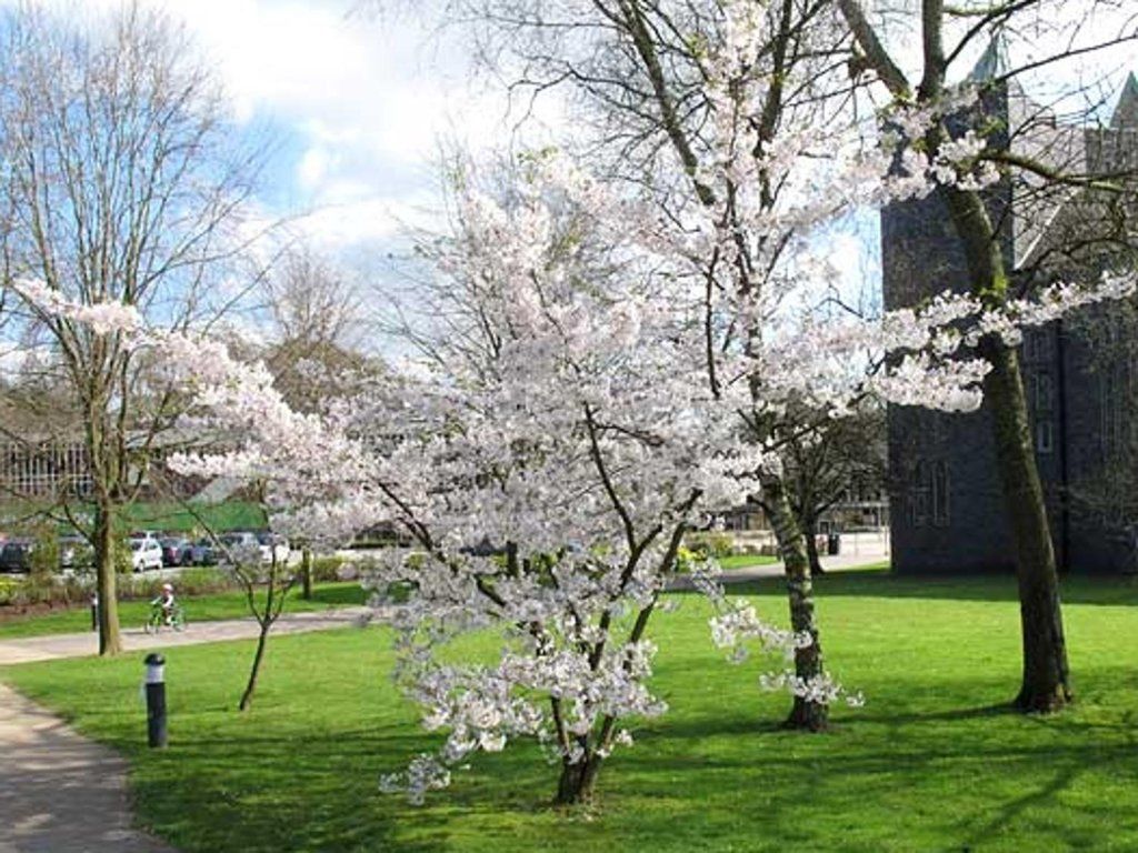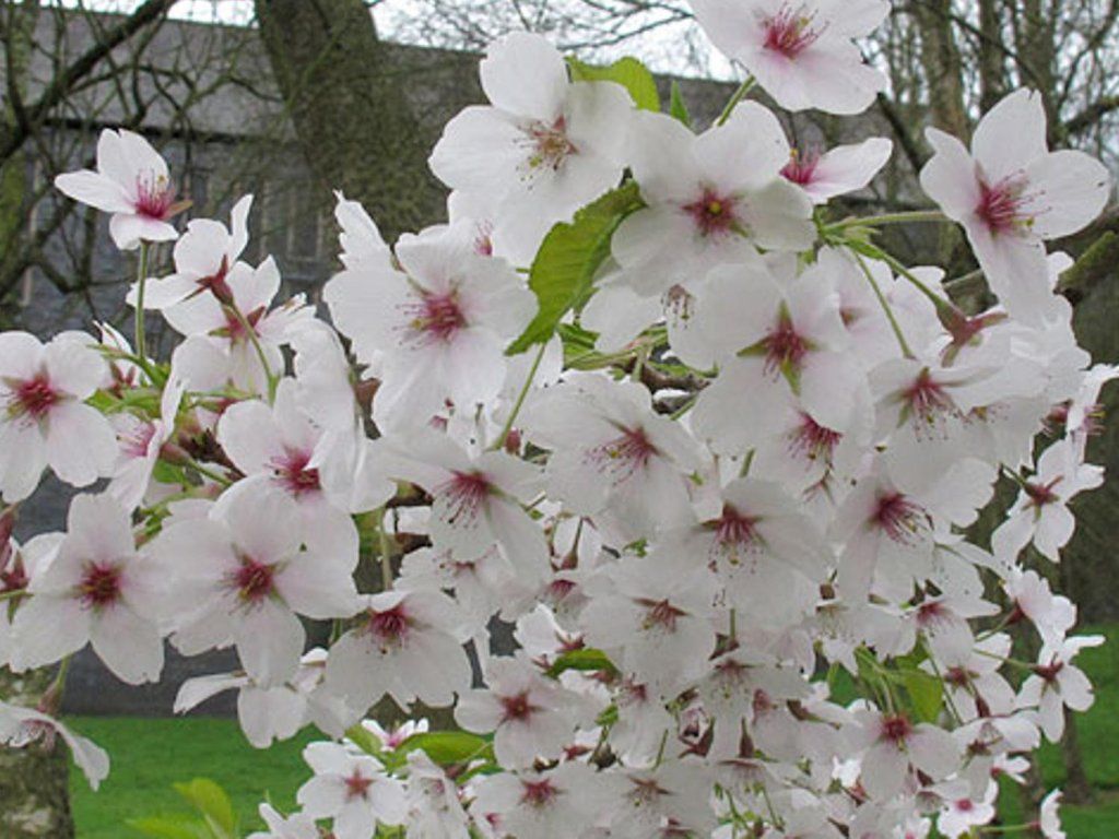 Yoshino-Kirsche 'Somei-Yoshino' - schnell wachsende, dekorative und hängende Form der Sakura. Wird normalerweise auf einen Stamm veredelt. Erreicht eine Höhe von 2 - 3 Metern. Die Äste wachsen senkrecht nach unten. Die Krone ist ungleichmäßig halbkugelförmig. Die Blätter sind breit und oval. Im Herbst verfärben sie sich gelb. Die Rinde ist glatt. Blüht im Mai mit strahlend weißen Blüten aus rosa Knospen. Duftet angenehm nach Mandeln. Trägt keine Früchte.