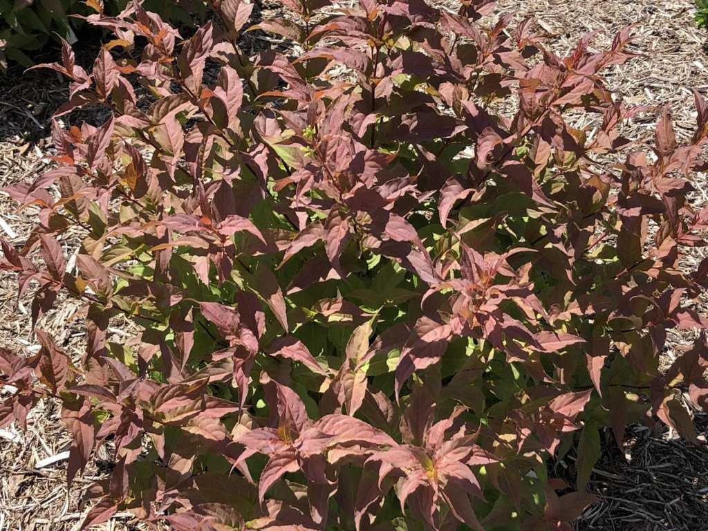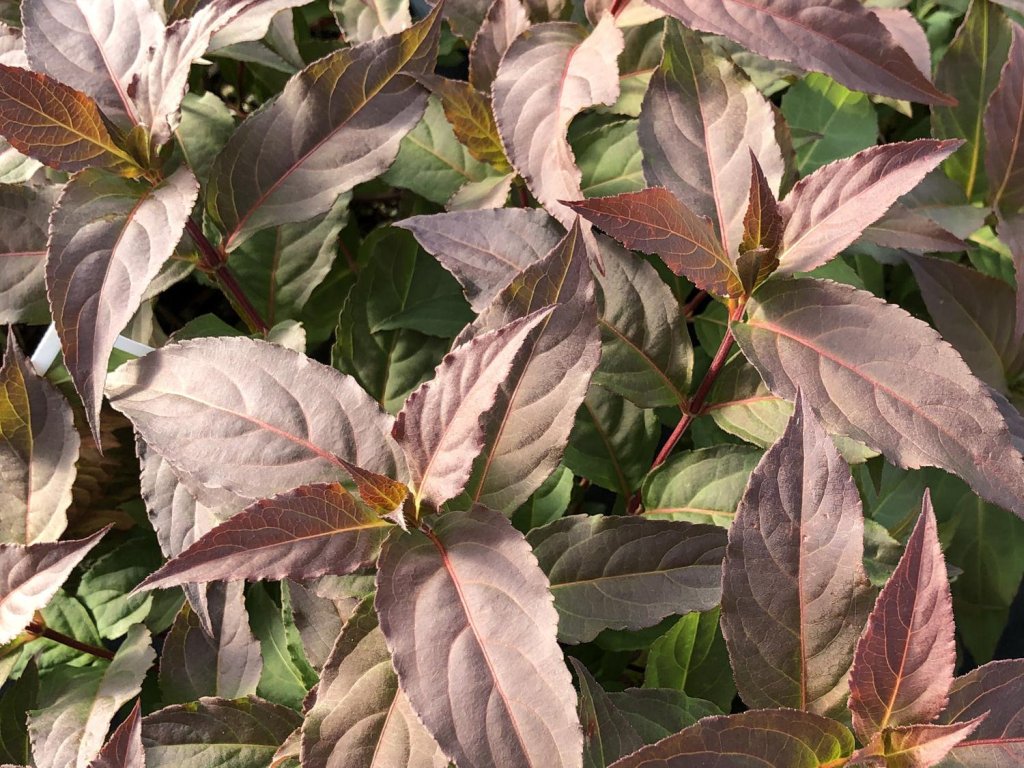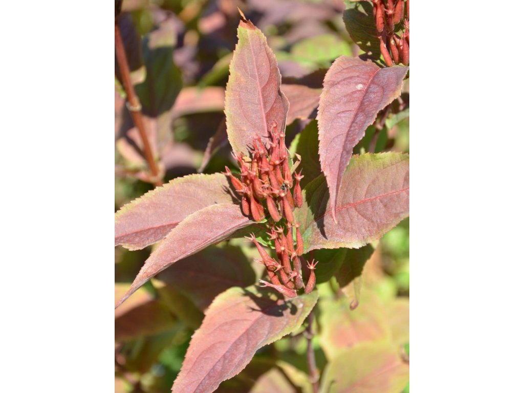 Diervilla KODIAK RED ´G2X885411´ - blühender Zierstrauch mit einem tiefen weinroten Farbton, der sich im Herbst leuchtend rot färbt. Er ist dicht verzweigt und laubabwerfend. Die ganze Saison erscheinen Trauben kleiner gelber Blüten. Er zieht Schmetterlinge und Bienen an. Die ganze Saison erscheinen Trauben kleiner gelber Blüten. Danach folgen dekorative rote Beeren. Diese bleiben bis zum Winter am Strauch.