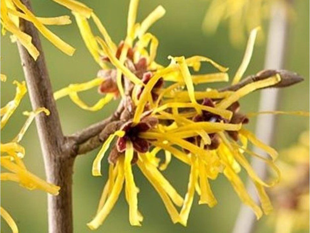 Winterhasel 'Anne' - Laubgehölz. Eine Winterhasel-Sorte mit hellgelben Blüten. Die Blüten haben die Form von kurzen Fransen, eine leuchtende Farbe, es gibt viele davon und sie wachsen auf kahlem Holz ohne Blätter. Kälte macht ihnen nichts aus, im Gegenteil, sie mögen sie. Wenn sie also gegen Ende des Winters blühen, halten sie bis zum Eintreffen der Wärme. Die Blätter ähneln Haselnussblättern, nur größer und fester, und im Herbst färben sie sich goldgelb bis orange. Mit 10 Jahren hat er eine Höhe von ca. 3 m.