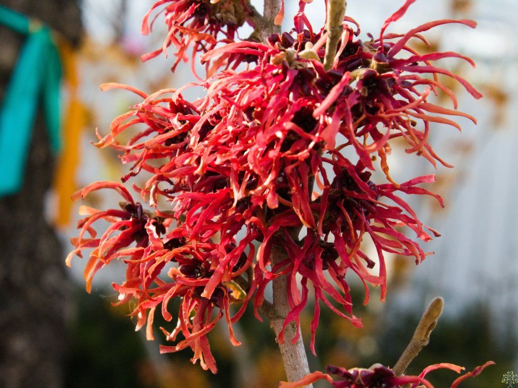 Zaubernuss 'Diane' - außergewöhnlich attraktiver und geschätzter Zierstrauch, bekannt vor allem für seine tiefroten bis weinroten Blüten im Winter und die wunderschöne Herbstfärbung der Blätter. Gehört zu den schönsten winterblühenden Sträuchern, die Farbe in den Garten bringen, wenn die Vegetation ruht. Wächst als langsam wachsender, laubabwerfender Strauch, normalerweise 2 bis 3 Meter hoch, im ausgewachsenen Zustand kann er auch breiter sein. Der Habitus ist aufrecht bis breitwüchsig, mit einer elegant verzweigten Krone. Die Blätter sind breit-oval, tiefgrün, im Herbst färben sie sich in deutlichen Orange-, Rot- und Violetttönen, was ein weiterer großer Vorteil dieses Kultivars ist. Die Blüten erscheinen von Januar bis März, oft schon im kältesten Teil des Winters. Sie sind sehr auffällig, gebildet aus schmalen, verdrehten, bandförmigen Blütenblättern. Die Blütenfarbe ist dunkelrot bis weinrot, manchmal mit einem leichten violetten Stich. Die Blüten duften zart und wirken exotisch, obwohl sie im Winter erscheinen. Ist voll frosthart, die Blüten vertragen auch stärkere Fröste, auch wenn sie sich bei sehr niedrigen Temperaturen vorübergehend zusammenziehen und nach der Erwärmung wieder öffnen.