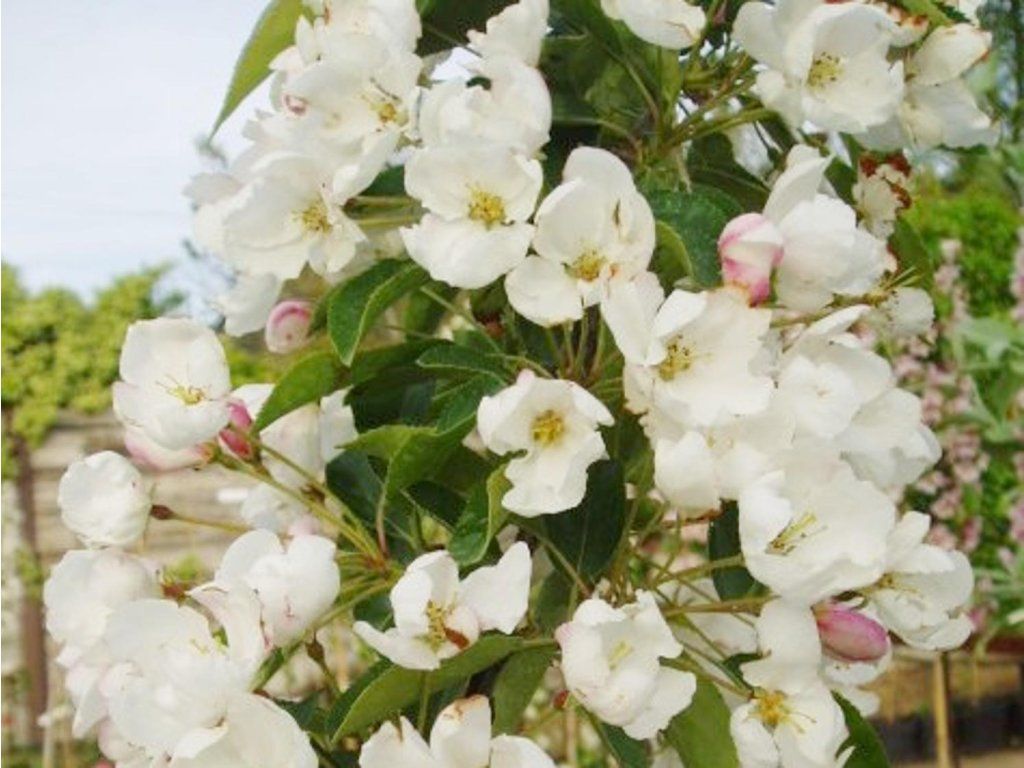 Zierapfel 'Adirondack' - eine bezaubernde Apfelsorte, die Eleganz und beeindruckende Schönheit in den Garten bringt. Sie zeichnet sich durch ausladende Sträucher aus, die eine Höhe von 2-4 m erreichen, manchmal auch Bäume bis 6 m. Ihr Wachstum ist regelmäßig mit einer schmalen trichterförmigen Form und leicht schräg aufstrebenden Ästen. Die Triebe dieses Apfelbaums haben eine schöne braun-rote Farbe, was für einen Eindruck von Vielfalt und Interesse sorgt. Die Blätter sind schmal eiförmig, oben dunkelgrün und die Unterseite der Blätter hellgrün. Beim Austreiben haben die Blätter einen rötlichen Schimmer. Blattstiele und Adern sind oft rötlich gefärbt, was der Pflanze ein weiteres Farbelement verleiht. Während der Blüte erscheinen dunkelrote Knospen, die sich zu reinweißen Blüten entwickeln. Diese duftenden Blüten sind einfach bis halb gefüllt, breitblättrig und haben einen Durchmesser von 3-4 cm. Sie bilden dichte Blütenstände mit 4-7 Blüten an dünnen, rötlichen Stielen. Die Frucht ist ein roter Apfel, länglich-oval, 6-8 mm breit. Im Herbst färben sich diese Früchte in ein erstaunliches scharlachrotes Rot, was dem Garten einen farbenfrohen Herbstzauber verleiht. Der Ursprung dieser Sorte liegt in Japan und China und sie entstand 1974, als sie von Donald R. Egolf selektiert wurde.