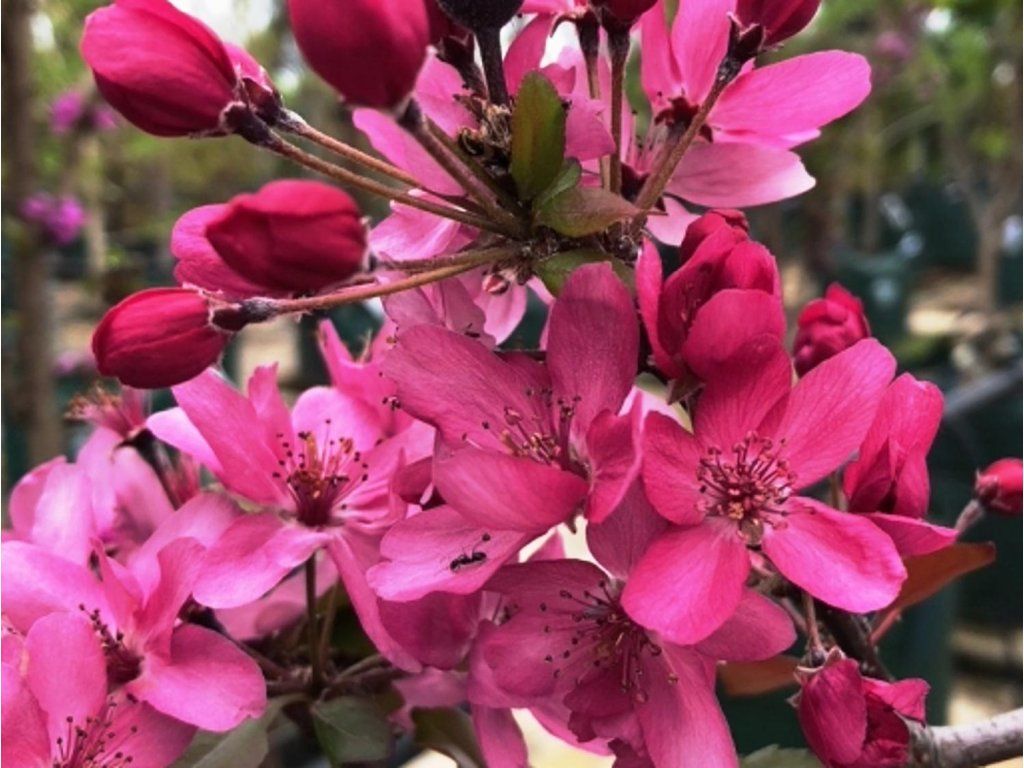 Zierapfel 'Aldenhamensis' - kleiner, laubabwerfender Baum, der bis zu 4m hoch und 3m breit wird. Die Baumkrone ist eher ausladend. Im Frühling hat er wunderschöne, einfache bis halbgefüllte Blüten in weinroter Farbe. Austreibende Blätter haben eine violett-bronze Farbe, im Laufe der Saison sind sie eher grün-bronze. Ab Ende des Sommers beginnen sich kleine Äpfelchen zu bilden. Diese sind zuerst grün-violett, in voller Reife dann tiefrot.