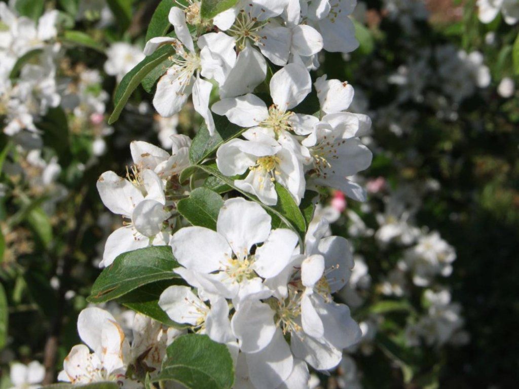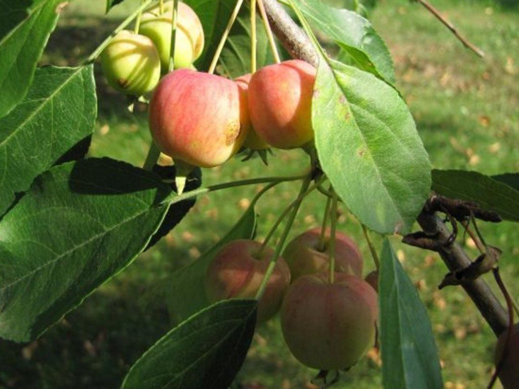Apfelbaum 'Cheals Crimson' - kleiner, laubabwerfender Baum, der im Erwachsenenalter eine Höhe von 3-4 m erreicht. Die Kronenform ist breit und offen. Im Frühling, im Mai, erscheint eine große Anzahl einfacher, weiß gefärbter Blüten. Ende des Sommers bilden sich kleine Äpfel, die nach dem Reifen eine rote Farbe haben. Sie sind essbar, aber eher als Vogelfutter geeignet.