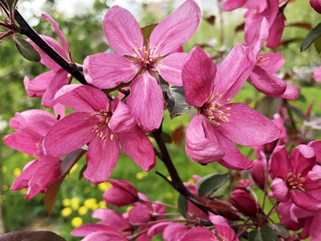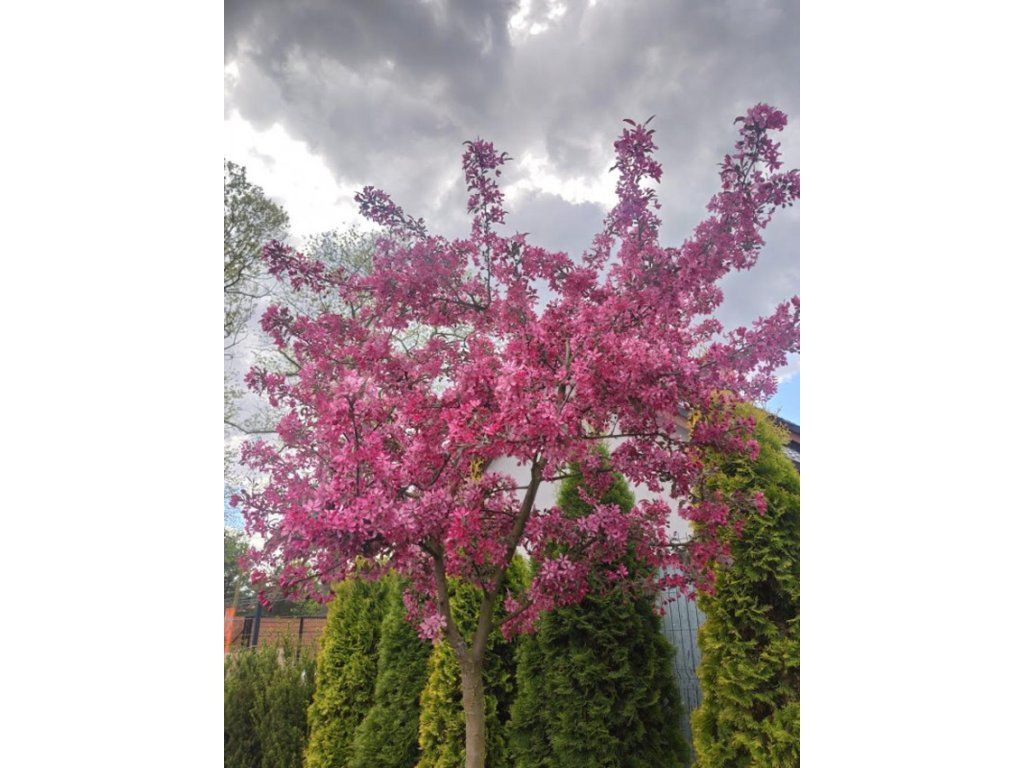 Zierapfel 'Diable Rouge' - moderne Zierapfelsorte französischen Ursprungs, gezüchtet für eine intensive rote Färbung von Blüten und Blättern. Wächst normalerweise bis zu einer Höhe von 4–5 m und einer Breite von 3–4 m und bildet eine regelmäßige, kugelförmige bis breit-eiförmige Krone. Die Blätter treiben dunkel purpurfarben aus, behalten im Sommer einen weinroten Farbton und färben sich im Herbst rotbraun. Die Blüten erscheinen im April bis Mai, sind einfach, tief karminrot und in reichen Blütenständen angeordnet. Nach der Blüte entwickeln sich kleine, kugelförmige, dunkelrote Früchte, die im September bis Oktober reifen und oft bis in den Winter am Baum bleiben. Die Früchte sind essbar, aber geschmacklich mild und eignen sich eher zur Verarbeitung oder als Vogelfutter. Die Sorte wird als Solitärgehölz, in Alleen kleineren Maßstabs und in städtischen Pflanzungen eingesetzt.