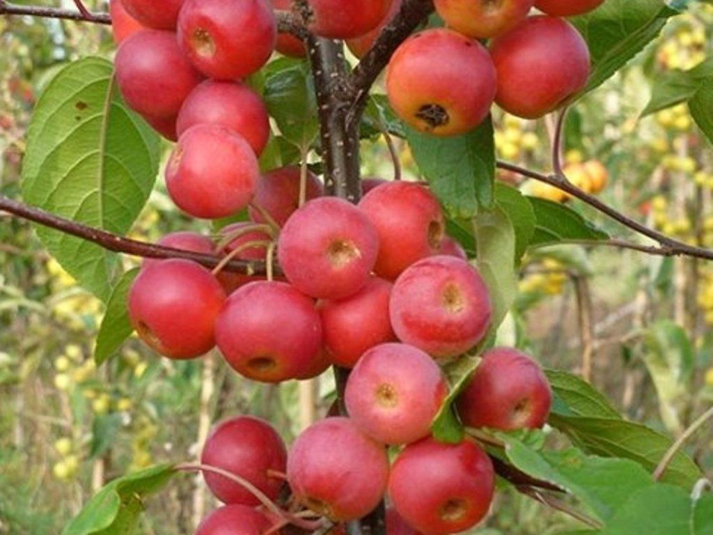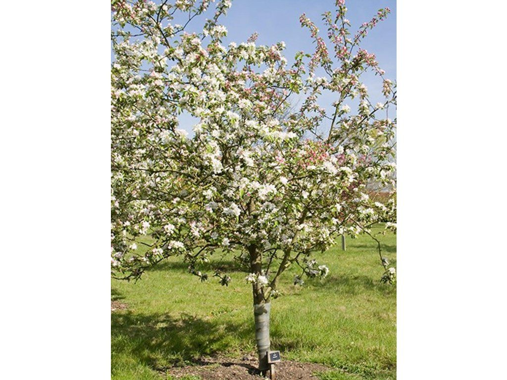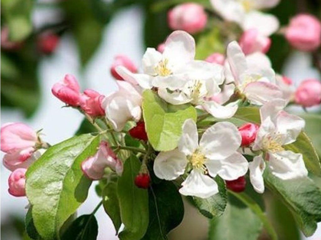 Zierapfel 'Gorgeous' - dieser Apfelbaum hat eine runde bis kugelförmige, halboffene Krone. Die Höhe der Sorte im Erwachsenenalter erreicht 5-6 m; dadurch eignet sich der Baum auch für kleinere und mittlere Gärten. Besonders schön ist er im Frühling, wenn aus rosa Knospen weiße, einfache Blüten austreiben, die den ganzen Baum buchstäblich übersäen. Die Frucht sind kleine, rote Äpfel mit einem Durchmesser von 4 cm.