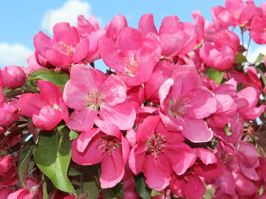 Zierapfel 'Henrietta Crosby' - ein Zierapfel, der eine halbkugelförmige bis kugelförmige Krone bildet. Die Äste sind breit und leicht schräg nach oben gerichtet. Er erreicht eine Höhe von ca. 3 - 5 m, je nach Kulturbedingungen. Die Knospen öffnen sich zu einfachen und leuchtend rosa Blüten. Nach der Blüte bilden sich kleine Äpfel mit stumpf-kegelförmiger Gestalt, die im Durchmesser etwa 2,5 cm erreichen. Sie sind rötlich und die Farbe der Schale spiegelt sich auch im Fruchtfleisch wider. Die Früchte eignen sich als Vogelfutter. Sie bleiben meist noch über den Winter am Baum. Die Sorte ist krankheitsresistent und voll frosthart.