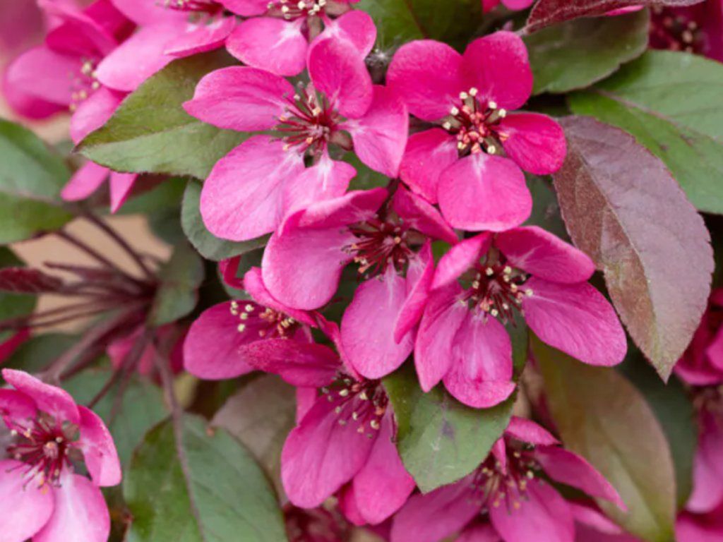 Zierapfel 'Magenta' - Zierapfel, der säulenförmig wächst. Er erreicht eine Höhe von etwa 2 - 2,5 m. Junge Blätter sind grau-violett gefärbt, später grün. Die Blüten sind attraktiv in purpurroten Tönen gefärbt. Im Laufe der Herbstmonate bilden sich Früchte, die klein, breit kugelförmig und purpurrot sind. Sie bleiben den ganzen Winter am Baum und dienen als Nahrung für Vögel. Dieser Apfelbaum wird zu einem interessanten Solitär in Ihrem Garten.