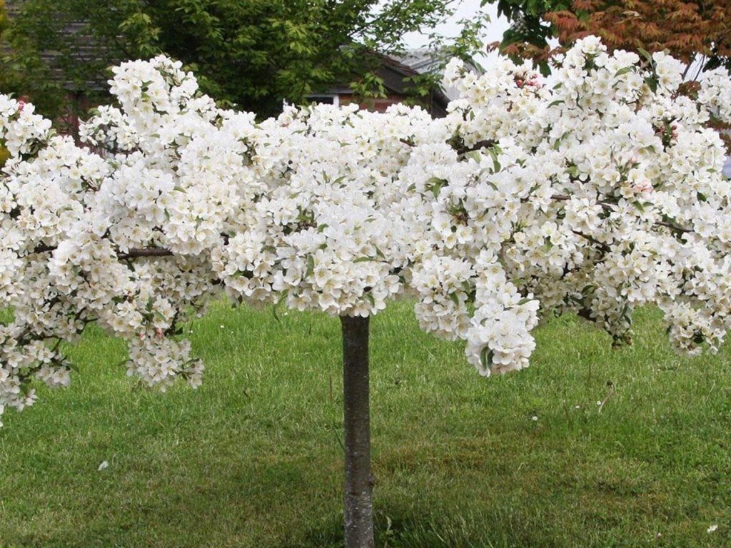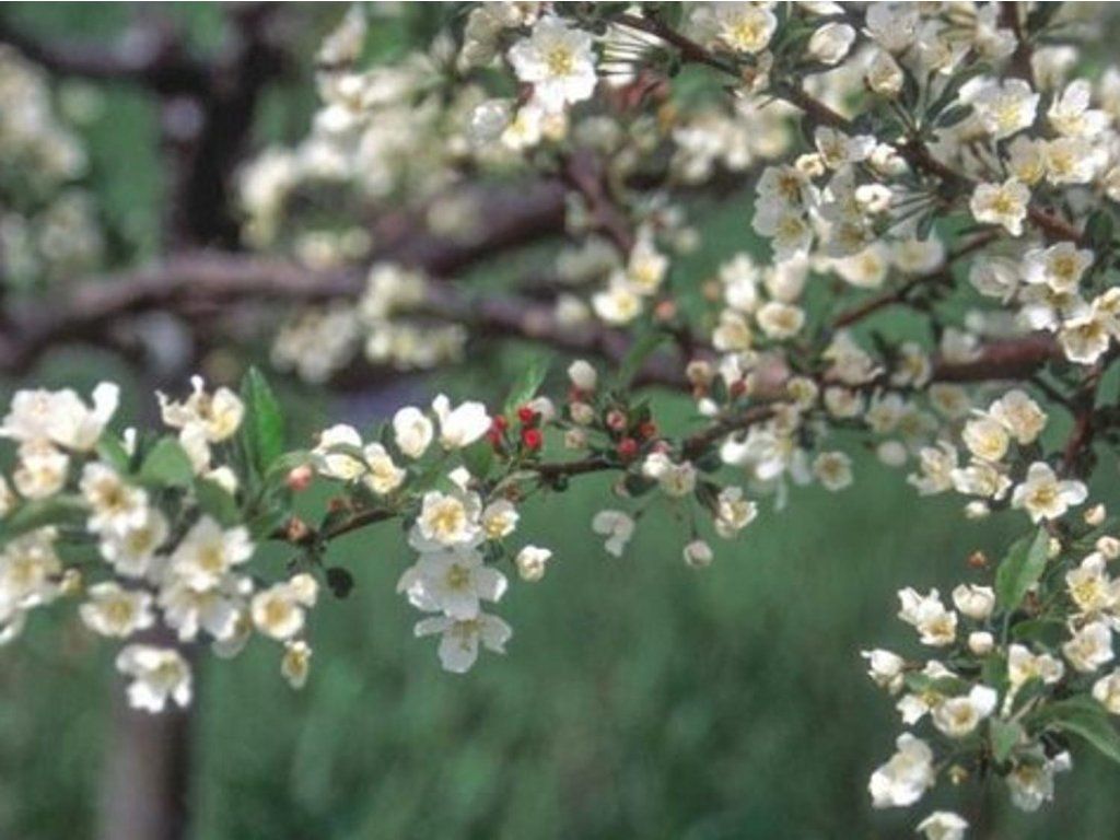 Zierapfel 'Tina' - perfekte Wahl für kleinere Gärten, da es sich um eine Zwergart handelt, die bis zu einer Höhe von 1,2-1,5 m bei gleicher Kronenbreite wächst. Sie hat sehr schöne, rosa-rote Knospen, die sich zu einfachen, duftenden weißen Blüten öffnen, die reiche Büschel bilden. Im Herbst entstehen attraktive, 0,5 cm kleine rote Äpfel. Sie dienen oft als Nahrung für Vögel. Die Blätter sind eiförmig und gelappt. Sie haben eine dunkelgrüne Farbe, vergilben im Herbst und fallen ab.