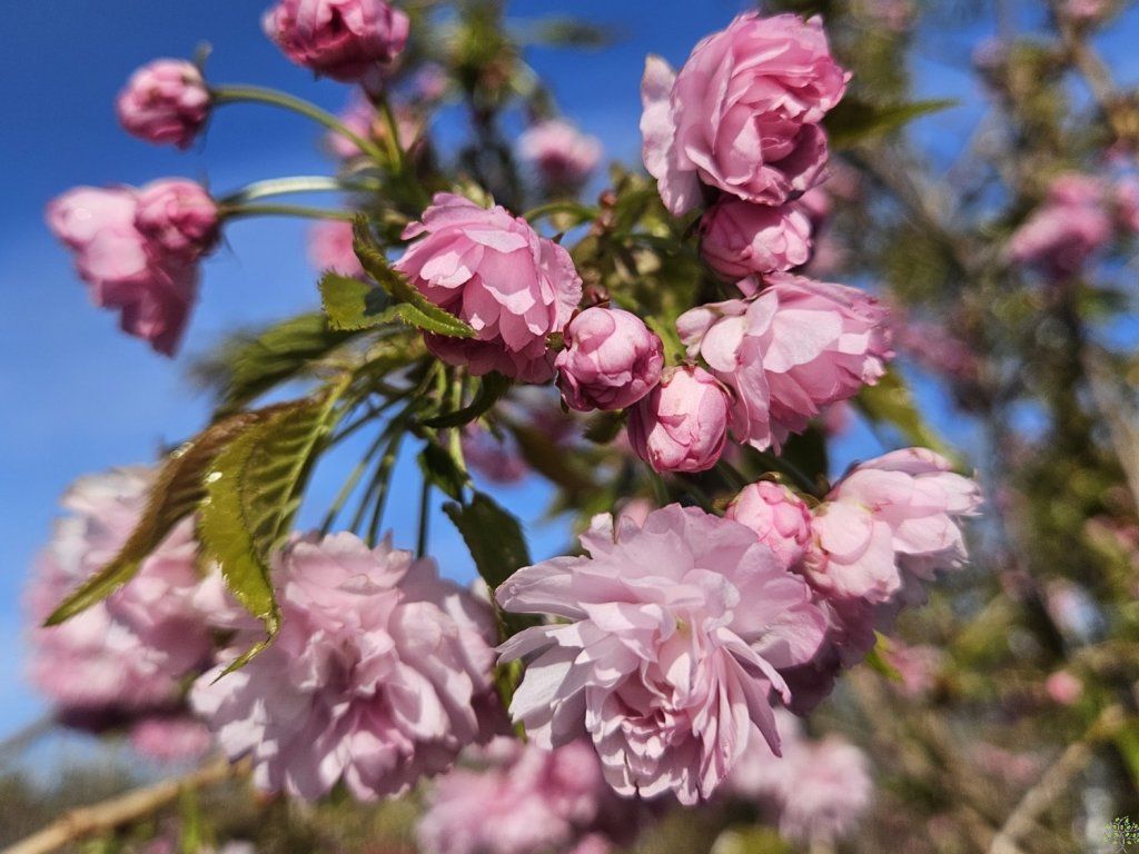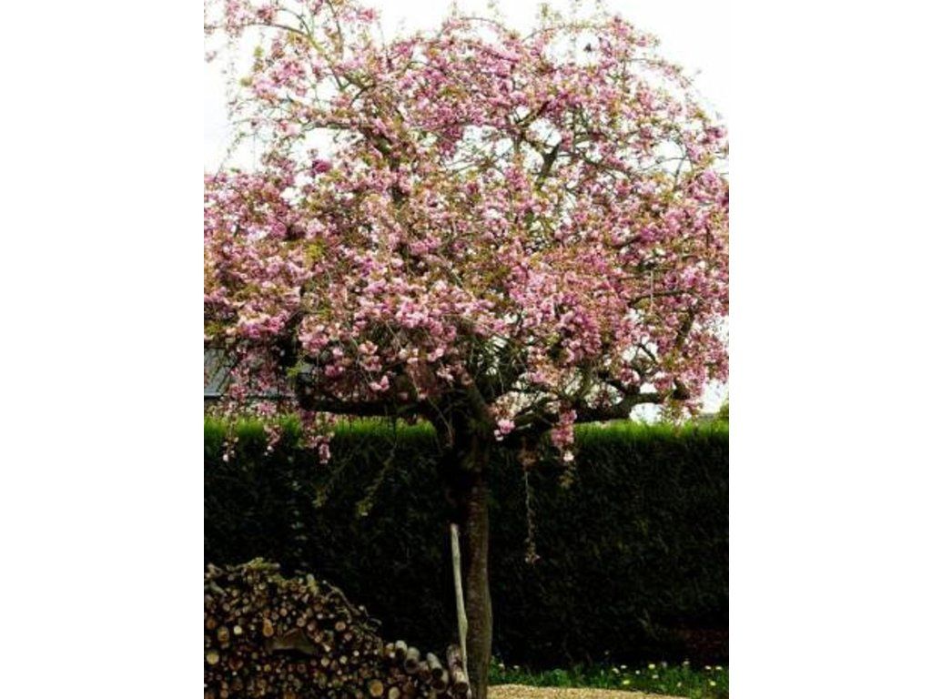 Zierkirsche 'Kiku-Shidare-Zakura' - eine Sorte der japanischen Zierkirsche, die aus Japan stammt, wo überhängende Kirschbäume traditioneller Bestandteil von Tempelgärten sind. Die Sorte wird für ihren ausgeprägten überhängenden Habitus und ihre gefüllten, mehrblättrigen Blüten in Dunkelrosa geschätzt. Die Blütezeit findet normalerweise im April statt, kurz vor dem Austreiben der Blätter, und dauert je nach Wetter etwa 10–14 Tage. Die Blätter sind laubabwerfend, elliptisch, frischgrün und färben sich im Herbst gelb bis orange. Der Baum erreicht im Erwachsenenalter eine Höhe von ca. 3–4 m bei einer Breite von 3 m, wobei die Endhöhe von der Veredelungshöhe abhängt. Die Früchte sind klein und wirtschaftlich bedeutungslos. In der Gartengestaltung wird sie als Solitär auf dem Rasen, an Wasserelementen oder in Kombination mit Frühlingszwiebeln und niedrigen Sträuchern eingesetzt. Ohne Veredelung erreicht sie eine Höhe von ca. 3 Metern und eine entsprechende Breite.
