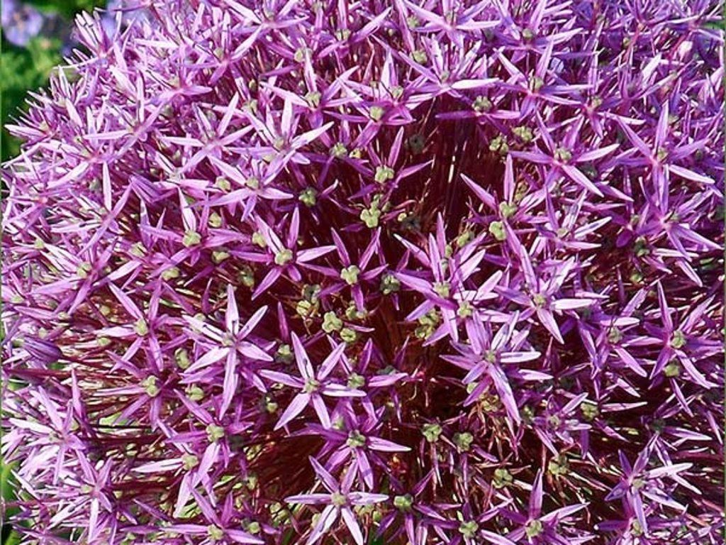 Knoblauch 'Universe' - eine sehr einzigartige Sorte von Zierknoblauch, die jedes Blumenbeet wunderschön ergänzt. Zur Blütezeit erreicht die Pflanze eine Höhe von etwa 60 - 70 cm. Die Blütenstände blühen an hohen und festen Stielen. In Form eines kugelförmigen Blütenstandes aus einer Ansammlung kleiner, dunkelvioletter Blüten. Die Blätter sind sattgrün und oval geformt. Die Blütezeit ist im April und Mai. Sie kommt in einem Beet oder in einem Topf mit anderen Sorten von niedrigen Stauden wunderschön zur Geltung. Er ist nicht anspruchsvoll in der Pflege und bringt ein einzigartiges Aussehen in jeden Garten.
