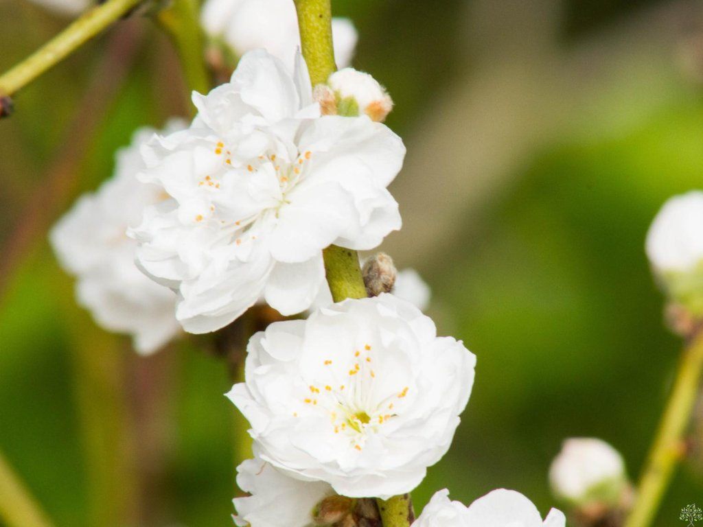 Zierpfirsich Taoflora White 'Mintao13' - schnell wachsender Baum, der im Erwachsenenalter eine Höhe von 4 m und eine Breite von 3 m erreicht. Er ergänzt die erfolgreiche Kollektion von Zierpfirsichen farblich. Im Frühjahr, noch vor dem Austrieb der Blätter, erscheinen halbgefüllte bis gefüllte Blüten, diesmal in weißer Farbe. Im Durchschnitt erreichen sie eine Größe von 3-5 cm. Später ergänzen sie die eiförmigen Blätter von grüner Farbe, die sich im Herbst orange, rot oder gelb färben, bis sie diese vollständig ersetzen.