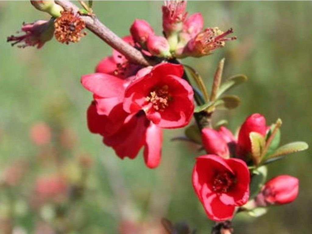 Zierquitte 'Rubra' - eine attraktive Sorte aus China. Sie erreicht eine Höhe von etwa 2,5 m und wächst recht üppig. Die Blüten sind wunderschön, leuchtend rot und etwa 4 cm breit. Sobald es nach dem Winter wärmer wird, öffnen sich die Blüten, meist ab Mitte April. Die Blütezeit ist lang, noch Ende Mai ist der Strauch mit Blüten geschmückt. Nach den Blüten bilden sich grün-gelbe Früchte, die im Oktober reifen. Die Blätter haben eine frische grüne Farbe, sind glänzend und laubabwerfend.