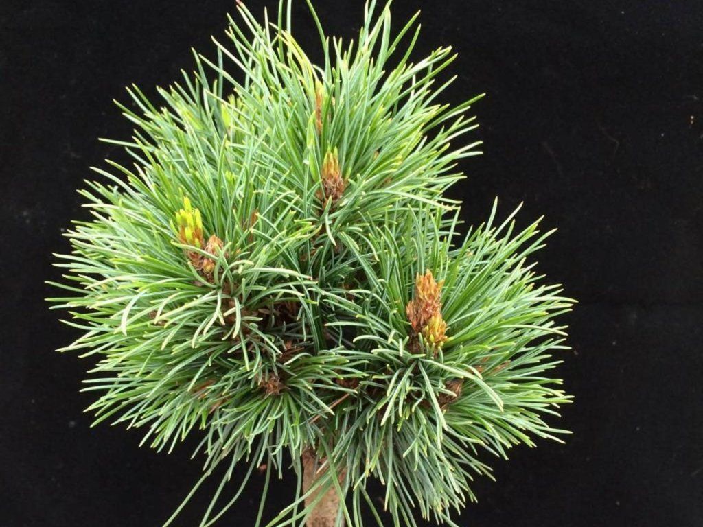 Zirbelkiefer 'David' - eine Gebirgsart der Alpen und Karpaten, bekannt für ihre weichen Nadeln in Fünferbündeln und ihre Langlebigkeit. Die Sorte 'David' gehört zu den Zwergformen, natürliche kugelförmige Auslesen. Sie zeichnet sich durch sehr langsames Wachstum mit einem jährlichen Zuwachs von etwa 3 cm und kurzen Nadeln von 25–40 mm in einem bläulich-grünen Ton aus. In der Jugend bildet sie eine dichte Kugel, nach 10 Jahren erreicht sie normalerweise einen Durchmesser von etwa 30 cm, in den folgenden Jahren wächst sie zu einem niedrigen Polster von etwa 0,6–0,9 m Breite und Höhe, je nach den Bedingungen. Die ältere Rinde dunkelt grau-schwarz nach und kontrastiert mit den helleren Trieben, die Winterknospen sind auffallend dreieckig. Dies ist eine Sorte, die sich für präzise Pflanzungen eignet, bei denen eine stabile Form ohne Schnitt gewünscht ist, z. B. für Steingärten, Schotterbeete, japanisch gestaltete Bereiche oder als niedriges immergrünes Element zwischen Stauden und Ziergräsern. Im Frühjahr, meist im Mai, erscheinen unscheinbare männliche Zapfen und kleine weibliche, rot bis violett, aus denen sich beim Artgenossen eiförmige Zapfen von 5–8 cm entwickeln. Bei Zwergformen erscheinen die Zapfen unregelmäßig und eher selten, daher ist die beständige Textur der Nadeln der Hauptwert. Die Nadeln verströmen beim Zerreiben einen harzigen Duft, der für Kiefern typisch ist. In der Komposition lässt sie sich gut mit Heidekraut und Glockenheide, Blaubeeren, Rhododendren, niedrigen Spiersträuchern und Steinkies kombinieren, der den bläulichen Nadelton hervorhebt. Aufgrund des langsamen Wachstums eignet sich die Sorte auch gut für Vorgärten am Haus, wo ein immergrünes Volumen ohne regelmäßige Formgebung gewünscht ist. Im Winter behält sie ihre Farbe ohne deutliche Bronzierung.