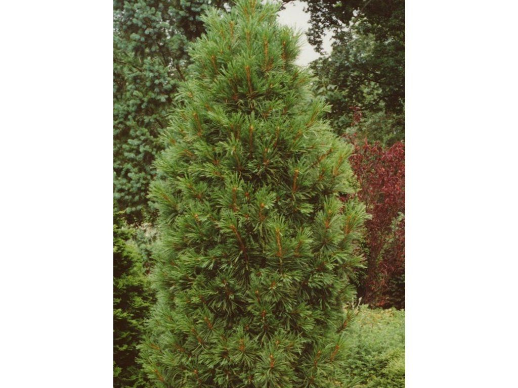 Zirbelkiefer 'Stricta' - attraktive Kiefernsorte, bekannt für ihr schmales, säulenartiges Wachstum. Dank ihres kompakten und vertikalen Wuchses ist sie als Zierbaum in Gärten und Parks beliebt. Sie wächst langsam und erreicht eine Höhe von 4-8 m, je nach Kulturbedingungen. Die Nadeln sind weich, hellgrün bis blaugrün, in Büscheln zu je fünf angeordnet. Die Rinde ist bei jungen Bäumen glatt und grau-braun, mit zunehmendem Alter wird sie schuppig und rissig. Die ideale Wahl, wenn Sie einen eleganten, schmal wachsenden Nadelbaum mit minimalem Platzbedarf suchen.