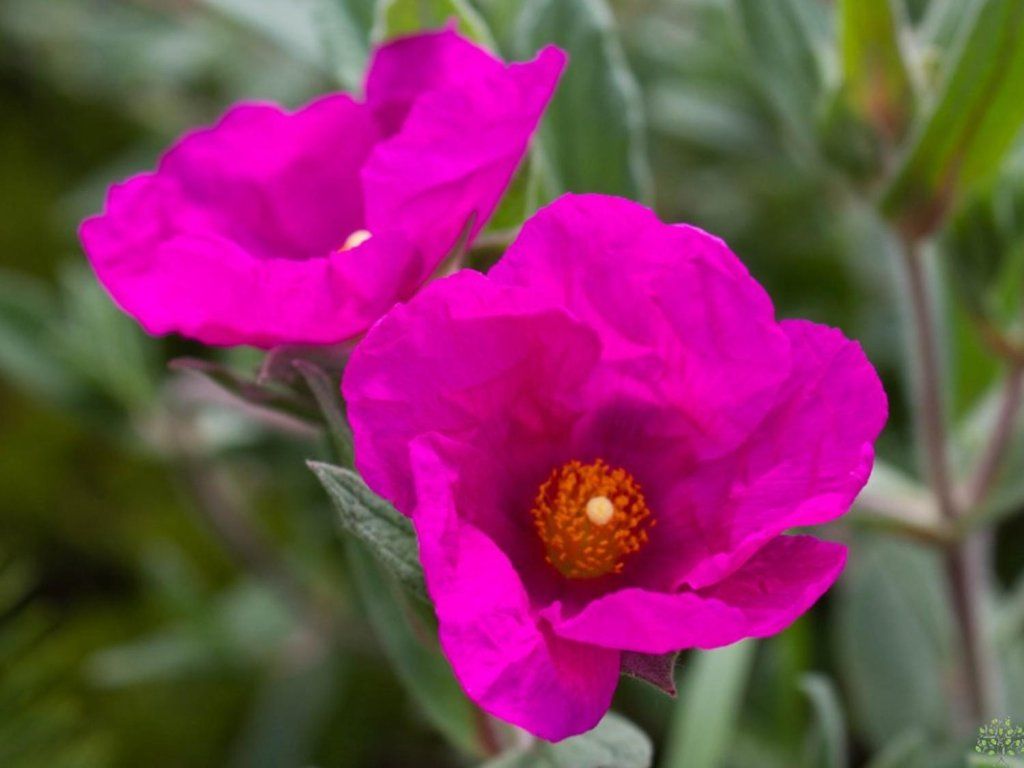 Felsrose, Zistrose 'Sunset' - Immergrüner, kleiner Strauch, der bis zu 0,6–0,9 m hoch und 1,8–2,4 m breit wird. Der Habitus des Strauches ist kompakt, leicht gewellt. Er besteht aus einer Vielzahl von filzigen, grau-grünen Blättern. Ab Ende des Frühlings erscheinen durchschnittlich 5 cm breite Blüten in leuchtendem Pink mit gelber Mitte. Die Pflanze ist frostbeständig bis -8 °C, daher ist es besser, sie als Kübelpflanze zu kultivieren.