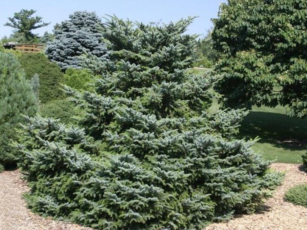 Blaufichte 'Howell's Dwarf' - einer der schönsten Sorten von zweifarbigen Fichten. Er kann eine Höhe von 1,8 m und eine Breite von 3,5 m erreichen. Die Nadeln sind auf der Oberseite hellgrün und auf der Unterseite blau-silbern. Die Astspitzen haben an sonnenexponierten Stellen einen gelblichen Schimmer. In der Jugend ist das Wachstum eher buschig, mit flachem Habitus, im Laufe der Jahre bildet er einen Baum mit pyramidenförmiger Spitze (kann entfernt werden, um flaches Wachstum beizubehalten). Neue Zapfen sind violett gefärbt.