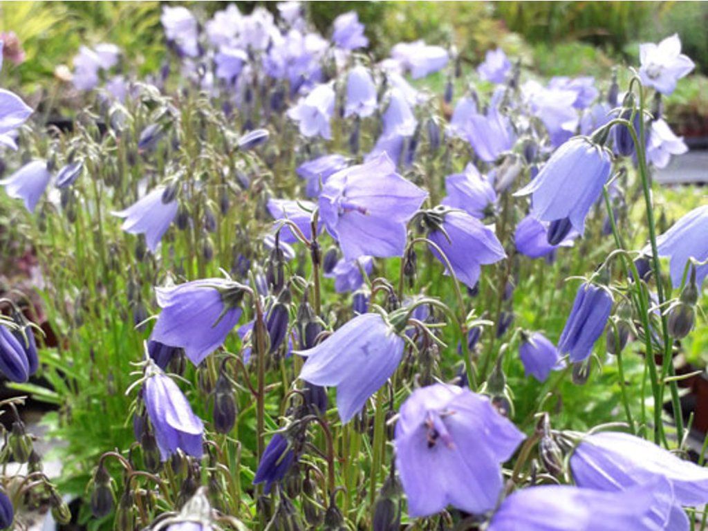 Glockenblume 'Advance Blue' - eine Gebirgsart, die aus den Alpen und anderen Hochgebirgsregionen Mitteleuropas stammt, wo sie auf felsigen Hängen, in Geröllfeldern und Felsspalten von Kalkgestein wächst. Die Sorte 'Advance Blue' wurde wegen ihrer satteren blauen Blütenfarbe und ihres gleichmäßigen, kompakten Wuchses ausgewählt. Sie bildet niedrige, dichte Polster von etwa 10-15 cm Höhe und 25-35 cm Breite. Die Blätter sind klein, löffelförmig, mittelgrün und bilden einen festen Bodendecker. Von Juni bis August erscheinen über den Blättern zahlreiche kleine, glockenförmige Blüten von 1,5-2 cm Größe in einem leuchtend blauen Farbton. Die Blüten wachsen an zarten Stielen und wirken sehr leicht. Die Art ist attraktiv für kleine Bestäuber und wird hauptsächlich in Steingärten, Trockenmauern, Schotterbeeten und Kübeln eingesetzt. In Kompositionen lässt sie sich gut mit Steinbrech, Gänsekresse, niedrigen Fetthennen oder Thymian kombinieren.