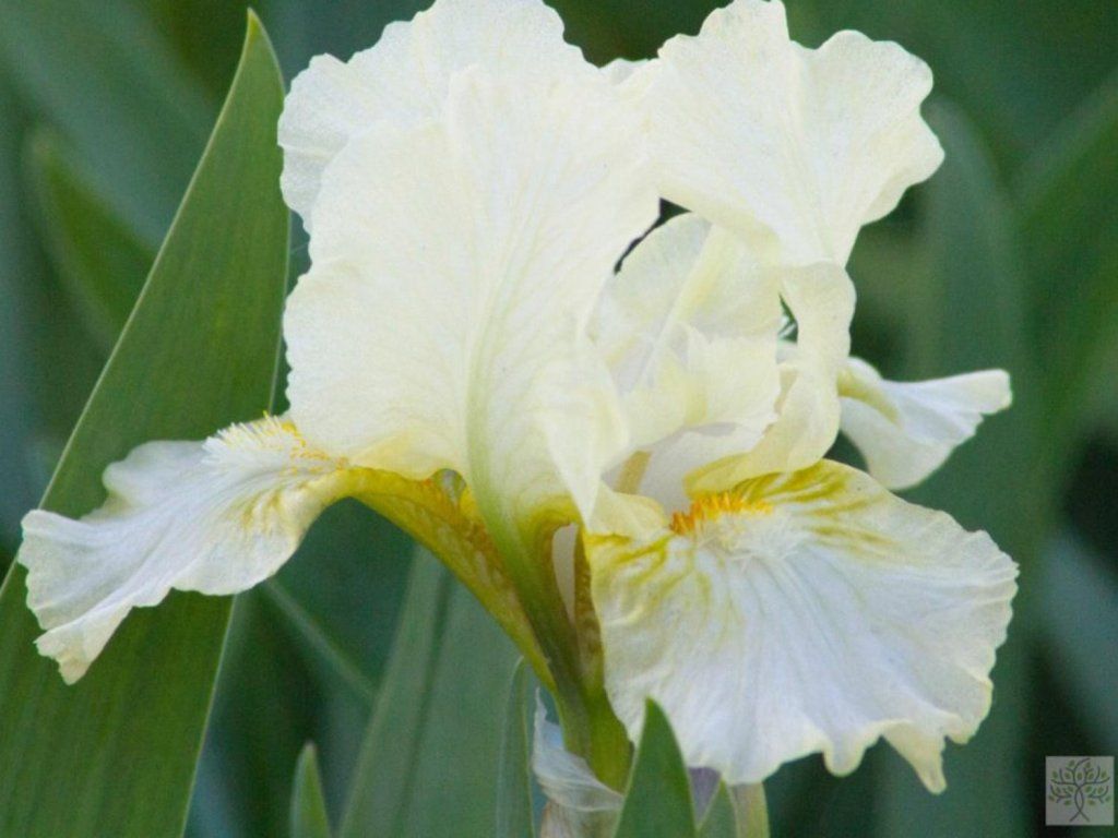 Zwerg-Schwertlilie 'Nylon Ruffles' - eine Gruppe von Zwerg-Bartiris mit einem Rhizom knapp unter der Oberfläche, die für sonnige, trockene und gut durchlässige Pflanzungen entwickelt wurde. Die Sorte 'Nylon Ruffles' wurde von Helen Doriot gezüchtet und 1962 von Dunbar und Reath registriert. Die Pflanze bildet kompakte Horste aus schmalen, graugrünen Blättern und ist im ausgewachsenen Zustand etwa 25–38 cm hoch und 30–40 cm breit. Die Blüten erscheinen von Mai bis Juni und haben cremeweiße Blütenhüllblätter mit deutlich gewellten Rändern, wobei der „Blütenbart“ eine gelbe bis gelbgrüne Färbung aufweist. Eine hellere Blume eignet sich gut für Arrangements, bei denen es darum geht, den vorderen Rand des Blumenbeets aufzuhellen, zum Beispiel neben blauen Salbeiarten, Ehrenpreisarten, niedrigen Glockenblumen oder silbrigen Kräutern. Die Blüten locken Bestäuber an und eignen sich gut als Schnittblumen. Bei Verzehr der Rhizome und Blätter ist eine Reizreaktion möglich. Die Sorte wird in historischen Beschreibungen mit den Auszeichnungen 'High Commendation' und 'Honorable Mention' in den Jahren 1962 und 1963 in Verbindung gebracht, was ihrer ausgewogenen Struktur und frühen Blüte entspricht. Die Abstammung umfasst die Kreuzung von 'Snow Flurry' und Linien mit Iris pumila, weshalb sie auch in Trockenheit ein kompaktes Wachstum beibehält. Dank ihrer kompakten Größe ist sie die perfekte Wahl für Steingärten, niedrige Beetränder oder Kübel.