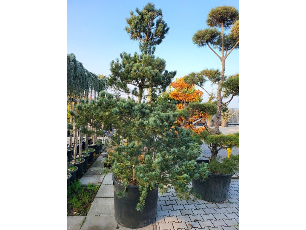 Japanische Mädchenkiefer - oder japanische weiße Kiefer, stammt aus den Bergregionen Japans, wo sie auf felsigen Hängen und in lichten Wäldern wächst. In Kultur wird sie seit dem 19. Jahrhundert geschätzt und gehört zu den bedeutenden Arten, die auch für die Bonsaigestaltung verwendet werden. Im ausgewachsenen Zustand erreicht sie unter mitteleuropäischen Bedingungen normalerweise eine Höhe von 4–8 m und eine Breite von 3–5 m, das Wachstum ist eher langsam. Die Krone ist jung kegelförmig, später breit eiförmig bis unregelmäßig mit waagerecht abstehenden Ästen. Die Nadeln wachsen in Büscheln zu je fünf, sind 4–7 cm lang, fein, leicht gedreht, blaugrün bis silbrig bereift. Im Frühjahr erscheinen unscheinbare männliche Zapfen und purpurfarbene weibliche Blüten, aus denen sich 5–8 cm lange Zapfen entwickeln, die im zweiten Jahr reifen. Die Art ist bis ca. −29 °C voll frostbeständig, ausgereifte Exemplare werden von normalen Wintern in der Tschechischen Republik nicht geschädigt. Sie wird als Solitär, in Kombination mit Rhododendren, japanischen Ahornen oder niedrigen Stauden eingesetzt, wo die feine Textur der Nadeln zur Geltung kommt.