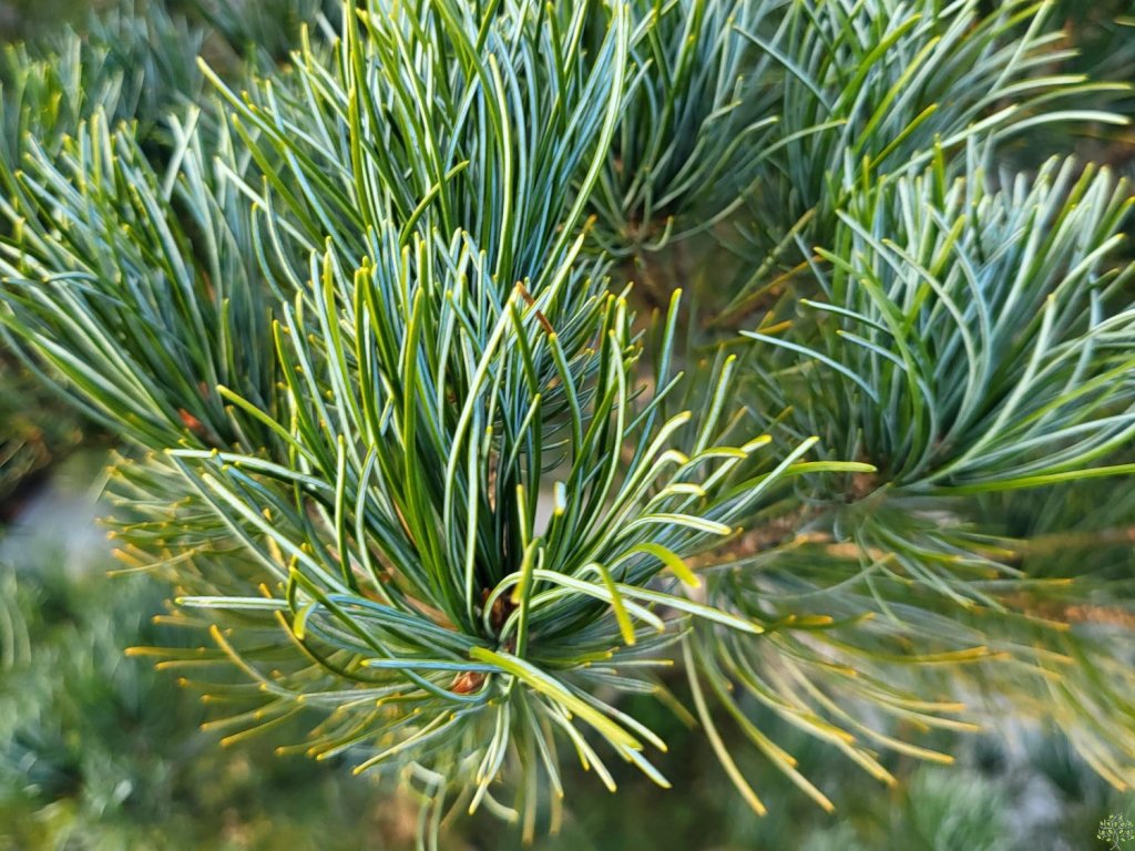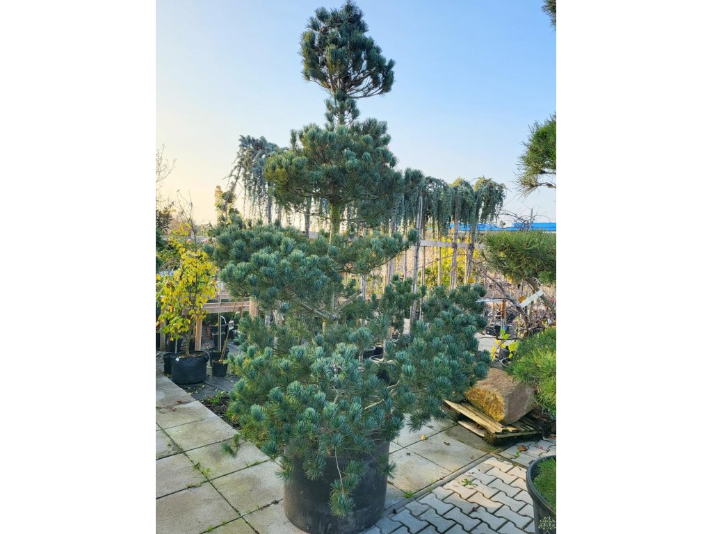 Kiefer 'Glauca' - die kleinblütige Kiefer stammt aus den Bergregionen Japans, wo sie an felsigen Hängen und gut durchlässigen Böden wächst. Die Sorte 'Glauca' wurde wegen ihrer ausgeprägten blau-grauen Nadeln und ihres kompakteren Wuchses im Vergleich zur Grundart ausgewählt. Unter unseren Bedingungen erreicht sie normalerweise eine Höhe von 3–5 m und eine Breite von 2–3 m bei einem langsameren jährlichen Zuwachs von etwa 10–20 cm. Die Krone ist breit kegelförmig bis unregelmäßig ausgebreitet, mit malerisch geschichteten Ästen. Die Nadeln sind 4–6 cm lang, leicht gebogen, wachsen in Fünferbündeln und haben einen auffälligen blau-silbernen Schimmer. Die Zapfen sind eiförmig, 5–8 cm lang, in der Jugend grünlich, später braun. Die Sorte wirkt harmonisch als Solitär in Vorgärten, in japanisch gestalteten Gärten oder in Kombination mit Steinen und niedrigen Stauden. Dank der feinen Textur der Nadeln bringt sie Leichtigkeit und Kontrast zu dunkelgrünen Nadelbäumen in die Komposition.