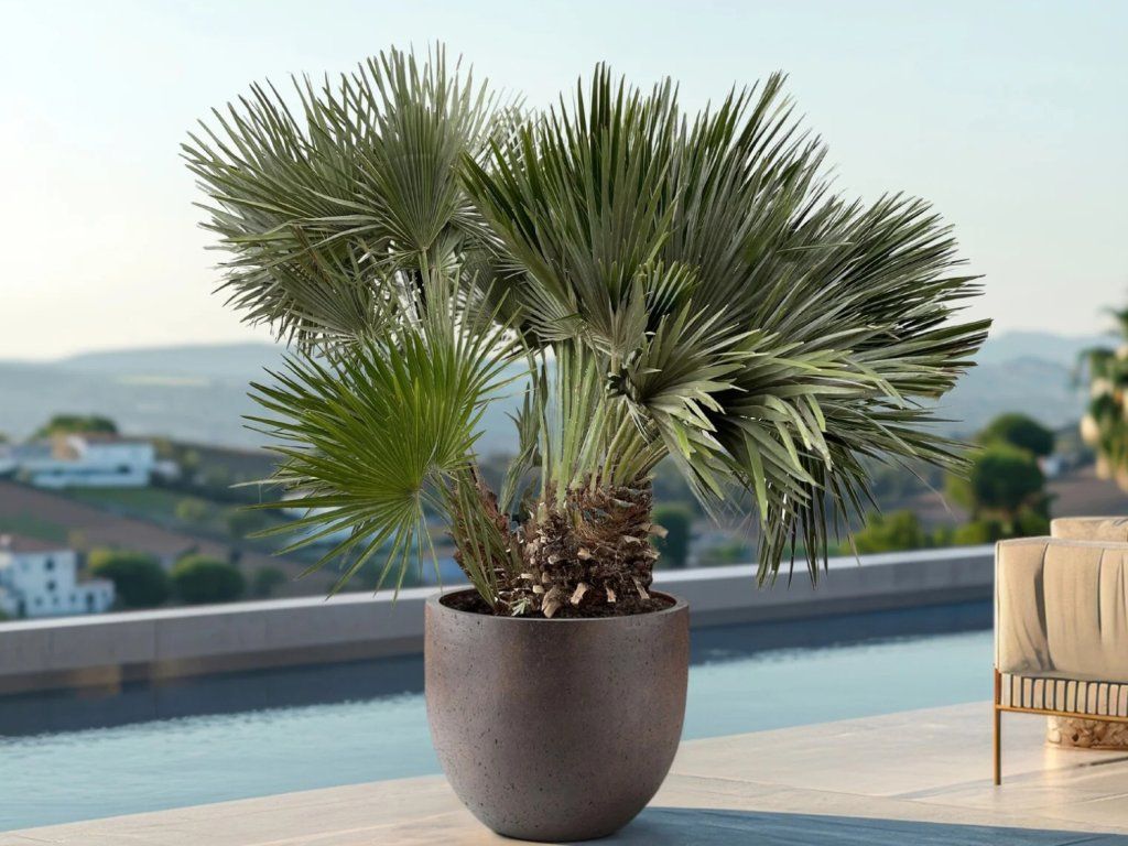 Pflege: Eine Palme, die für einen sonnigen, geschützten Standort mit ausreichend Licht geeignet ist. Bevorzugt gut durchlässige, leichte, sandig-lehmige Böden mit neutraler bis leicht alkalischer Reaktion und ausreichend organischem Material. Gedüngt wird während der Vegetationsperiode, empfohlen werden Kalium- und mikroelementreiche Dünger, die das Blattwachstum und die allgemeine Vitalität der Pflanze fördern. Die Bewässerung muss regelmäßig erfolgen, insbesondere bei jungen Pflanzen; der Boden sollte feucht sein, aber Staunässe im Wurzelballen darf nicht auftreten. Bei der Pflanzung mehrerer Pflanzen wird empfohlen, einen Abstand von mindestens 1–2 Metern einzuhalten, damit sich die einzelnen Palmen vollständig entwickeln können. Der Rückschnitt erfolgt im Frühjahr, dabei werden alte, beschädigte oder abgestorbene Blätter entfernt und gegebenenfalls die Krone geformt. Sie ist teilweise frostbeständig, in kälteren Regionen ist es ratsam, junge Pflanzen mit einer Winterabdeckung oder Mulch zu schützen, um sie vor Temperaturschwankungen zu bewahren.